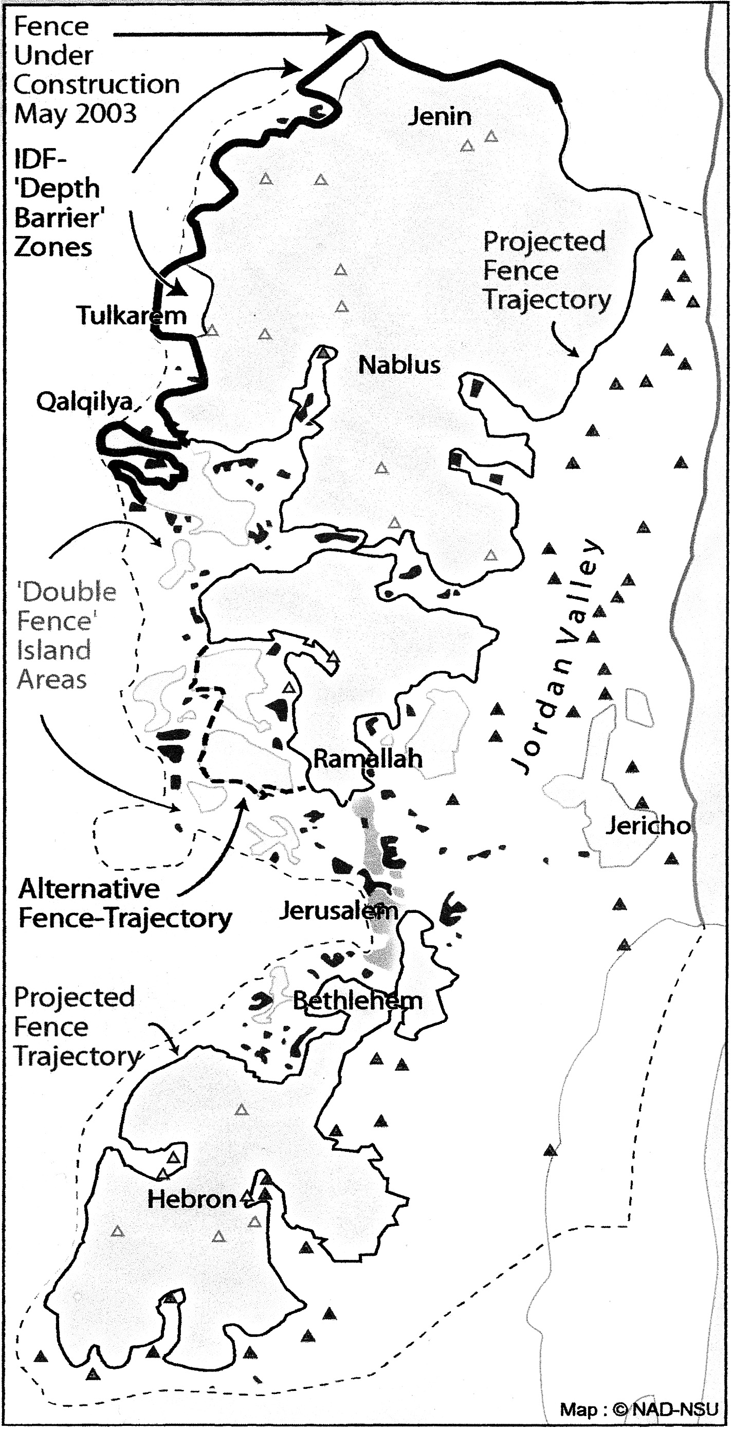 Met de Muur geeft Israël de doodsteek aan de toekomstige Palestijnse staat. Met een geschatte lengte van 650 kilometer, zal de Muur de Westelijke Jordaanoever in een noordelijke en zuidelijke helft opdelen en de Palestijnse dorpen en steden van elkaar isoleren. De Palestijnse bevolking zal geen toegang meer hebben tot Oost-Jeruzalem en haar leefruimte beperkt zien tot ongeveer 45 procent van de Westelijke Jordaanoever. Indien de Israëlische regering haar plannen doorzet, komt er nog een oostelijke muur van 350 kilometer bij.