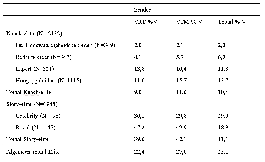 Ietwat contra-intuïtief komen er met 25,1 procent gemiddeld meer vrouwen voor in elitefuncties dan in de rest van het nieuws. Dat is vreemd, aangezien eerder onderzoek ons deed verwachten dat het mannelijke overwicht in de elite nog groter zou zijn dan in de rest van de samenleving. Een verklaring is echter vlug gevonden wanneer we even kijken naar de samenstelling van de elitefuncties in volgende tabel. Bij de eerste vier functies vinden we veel minder vrouwen terug dan gemiddeld. Het is de ‘Knack-elite’2 die hoge posities inneemt in het diplomatiek, economisch en/of gerechtelijk veld, stuk voor stuk echte mannenbastions. Dit in tegenstelling tot de functies van royal of celebrity (de mensen die gewoonlijk een tijdschrift als Story kleur geven), waarbij vrouwen relatief hoog scoren. Wat de Knack-elite betreft zijn ‘bedrijfsleiders’ en ‘experts’ vaker vrouwen bij VRT dan bij VTM. Dit gegeven ondersteunt onze hypothese. Bij de ‘hoogopgeleiden’ scoort VTM dan weer beter, en vermits die laatste categorie veel meer gevallen telt dan de drie vorige is de totaalscore van de Knack-elite gunstiger voor VTM dan voor VRT. De openbare omroep komt er hier eigenlijk slechter uit dan ze verdient. Die ‘hoogopgeleiden’ bestaan namelijk voor bijna 75 procent uit magistraten, advocaten en rechters. Nu is het inderdaad zo dat VTM bij deze beroepen procentueel gezien iets meer vrouwen toont dan VRT, maar de commerciële zender haalt buitengewoon veel voordeel uit dit kleine verschil omdat ze systematisch veel meer advocaten en openbare aanklagers laat opdraven dan VRT. De openbare omroep komt hier dus slecht uit de verf omdat ze minder nieuws brengt over misdaad en criminaliteit.