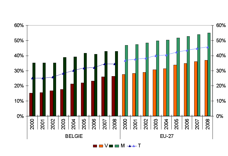 Positief uitgedrukt kunnen we zeggen dat de werkgelegenheidsgraad van ouderen tussen 55 en 65 jaar aan een constante opmars bezig is. Maar het rechterdeel van de grafiek, dat de gemiddelde evolutie weergeeft van de 27 lidstaten van de Europese Unie, wijst ons op de harde realiteit: we gaan niet sneller vooruit dan het Europese gemiddelde, en dat niettegenstaande onze grote achterstand. De grootte van die achterstand kan bovendien goed afgelezen worden van deze grafiek: we staan 9 à 10 jaar achter. Van de noodzakelijke inhaaloperatie is er dus nog geen sprake.