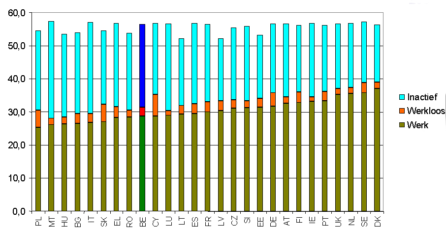De huidige 15-jarige Belg heeft gemiddeld nog 64,5 jaar te leven, waarvan gemiddeld 56,3 jaar voor zijn 75ste verjaardag. Dit stemt vrij goed overeen met de situatie in de meeste andere EU-landen. Van die 56,3 jaar zal de Belg er 31,4 jaar op de arbeidsmarkt doorbrengen, waarvan minder dan 29 jaar al werkend. En hier zijn er wel verschillen met de andere EU-landen. Met onze buurlanden loopt het verschil op tot 2,6 jaar met Frankrijk, 4,4 jaar met Duitsland, 5,6 jaar met het Verenigd Koninkrijk en 6 jaar met Nederland. Ten opzichte van het best presterende land, zijnde Denemarken, gaat het om 7,6 jaar verschil. Deze internationale vergelijking dateert van 2005, maar een herhaling van die oefening voor België op basis van de meest recente cijfers levert geen vooruitgang op. Het mag duidelijk zijn dat een dergelijk vooruitzicht geen optie is voor de toekomst. Een gedragswijziging is dus absoluut noodzakelijk.