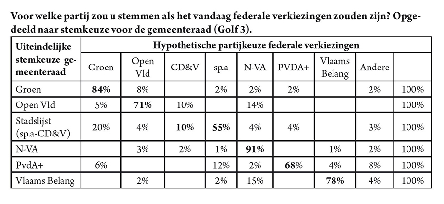 Bovenstaande resultaten worden weerspiegeld in stemkeuzes van de Antwerpse kiezers mochten er op het moment van de bevraging (eind oktober) federale verkiezingen zijn. Ook hier zouden de kiezers die op stadsniveau voor N-VA stemden, massaal (91%) terug voor N-VA kiezen. Bij geen enkele andere partij is de consistentie in stemgedrag zo groot. Enkel Groen (84%) lijkt ook vrij zeker te zijn van zijn kiezers op nationaal niveau. De Stadslijst bestaat zoals te verwachten uit overwegend sp.a-kiezers, terwijl slechts één op tien nationaal op dit moment voor CD&V zou stemmen. Net zoals bij de districtraadsverkiezingen zien we dat de Stadslijst op gemeenteniveau toch een aanzienlijk deel groene kiezers heeft weten te verleiden. Tot slot merken we op dat de aanhangers van Open Vld, een zeer kleine partij in Antwerpen, hun partij niet automatisch volgen naar het nationale niveau.