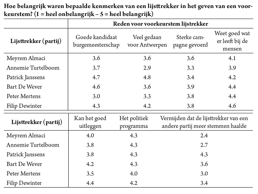 Waarom precies men voor deze lijsttrekker heeft gestemd, verschilt ook tussen de partijen. Niet verwonderlijk vinden de kiezers van alle partijen het programma van de lijsttrekker belangrijk. De kiezers van Janssens deden dat vooral om zijn bestuurskwaliteiten: hij heeft veel gedaan voor de stad en is een goede kandidaat voor het burgemeesterschap. Opvallend veel kiezers geven ook aan dat de keuze voor Janssens minstens gedeeltelijk is ingegeven door het streven om te vermijden dat ‘een andere lijsttrekker’ meer stemmen haalde. Bij De Wever speelt zijn link met de kiezer een grotere rol: hij weet goed wat er leeft en kan het goed uitleggen. De campagne lijkt opnieuw niet echt grote verschillen op te leveren tussen de verschillende kandidaten. Al blijkt wel dat, in vergelijking met de verkiezingen van 2006, de campagne van Janssens niet echt indruk heeft gemaakt. Uit ons onderzoek bleek toen dat ‘de campagne’ bij de kiezers van Janssens veel vaker werd genoemd in vergelijking met de campagne van de andere lijsttrekkers.3