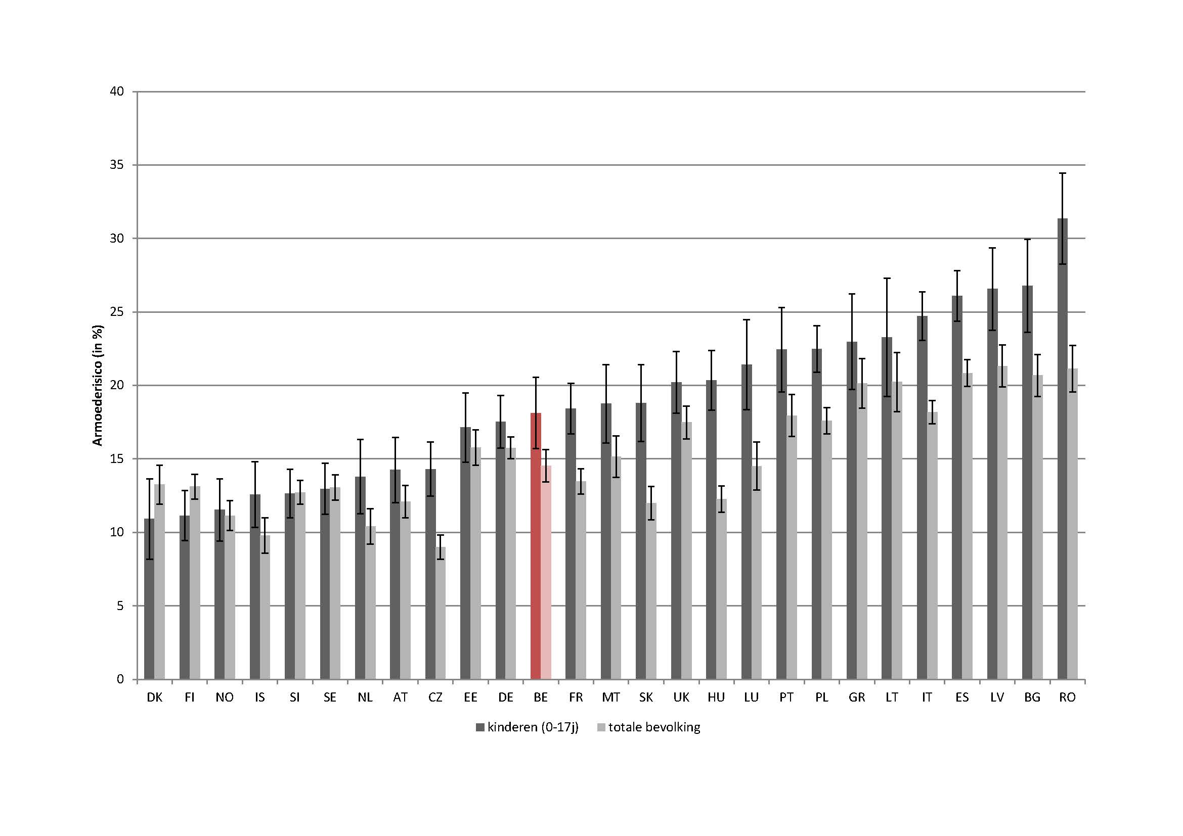 Figuur 1: Armoederisico voor kinderen en de ganse bevolking, Europese landen, 2009.