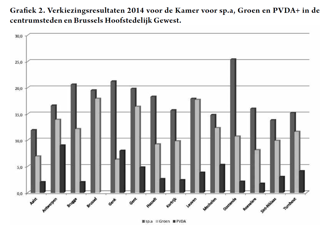 Wouter Van Besien vestigde na de verkiezingen de aandacht op de sterke scores van Groen in een aantal grote steden. Die zouden er op wijzen dat Groen kan uitgroeien tot het linkse alternatief in die steden, en mogelijk ook de trend van de toekomst aangeven. In Grafiek 2 gaan we dit in de realiteit na en vergelijken we de scores van sp.a, Groen en PVDA+ in de Vlaamse centrumsteden (federale verkiezingen 2014) en het Brussels Hoofstedelijk Gewest (regionale verkiezingen 2014).