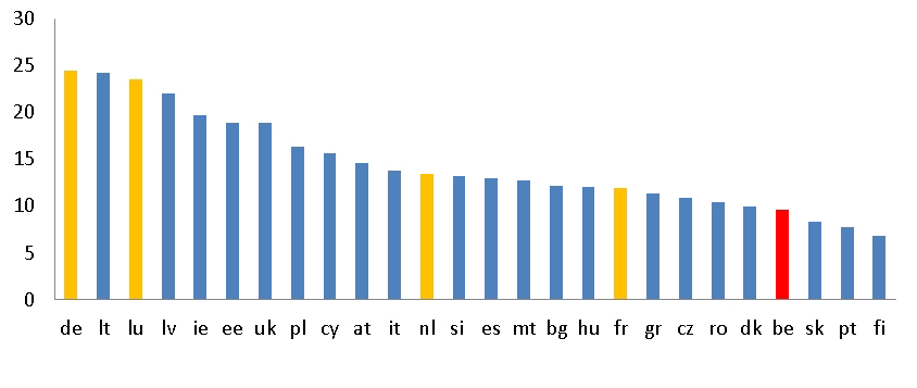 Grafiek1 geeft het aandeel werknemers dat zijn loon aangepast zou zien als er een dergelijk Europees minimumloon ingevoerd zou worden. Duitsland neemt de koppositie in met bijna 1 op 4 werknemers dat een aanpassing in zijn loon zou zien.4 Het percentage voor België is bij de laagste vijf en is beduidend lager dan het percentage in onze andere buurlanden.