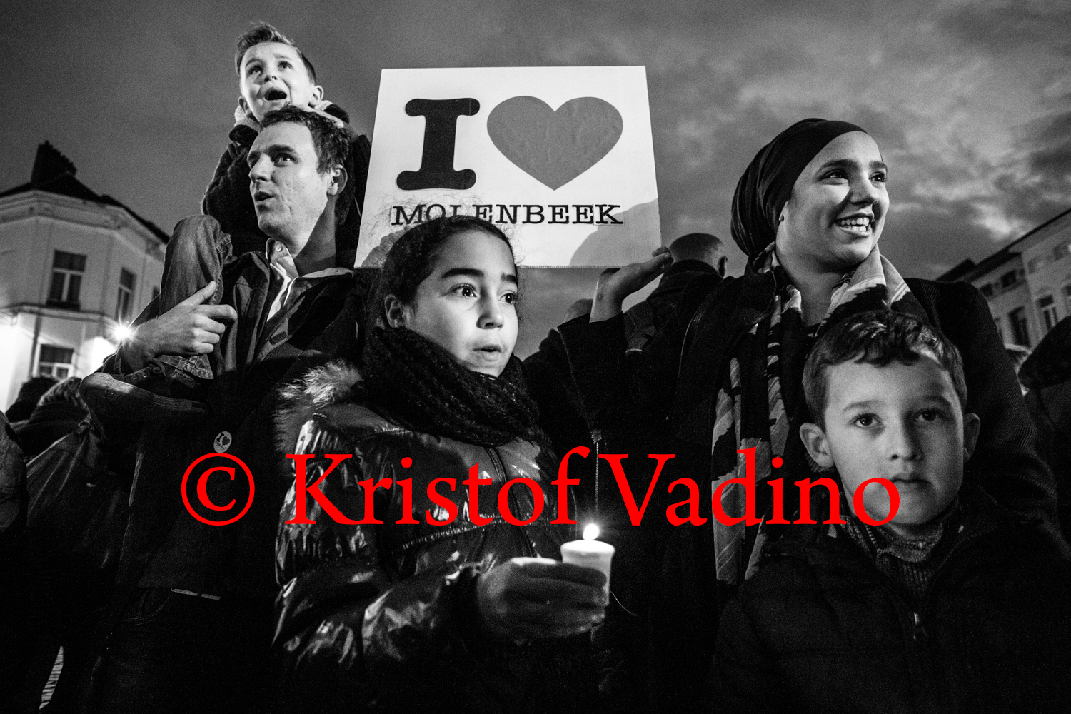 Kristof Vadino fotografeert sinds anderhalf jaar voor kranten, magazines en ngo’s. Eind november trok hij met camera in de hand door Molenbeek, toen veelvuldig in het nieuws en vaak beschreven als een getto van de jihad. De solidariteitsmars nuanceerde dat beeld. Molenbeek is geen banlieu van Brussel, maar wel een complexe gemeente. Tegelijk harder én warmer dan veel andere plaatsen in België. Doordrongen van de evenementen en de media-aandacht vervolgde het leven in de Molenbeek zijn gang. Met armoede, overbevolking en werkloosheid, die hun deel opeisen als één van de oorzaken van het jihadisme.