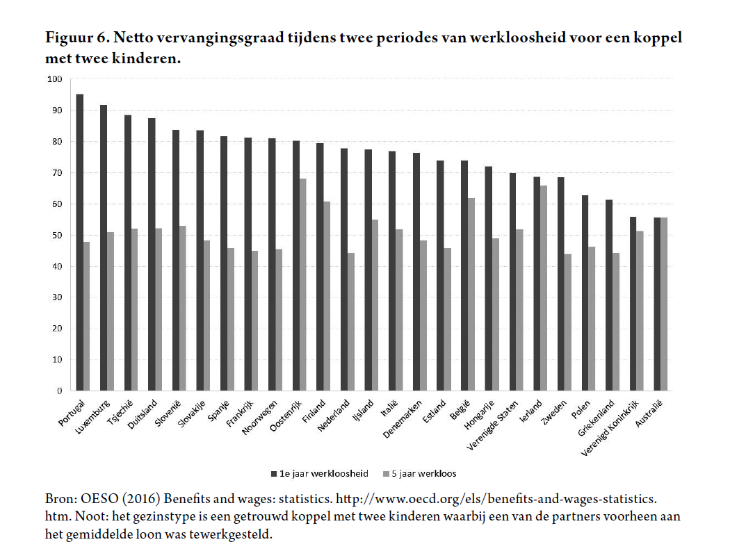 Figuur 6 toont de gemiddelde netto vervangingsgraad (dat is het bedrag dat men te besteden heeft in een situatie van werkloosheid uitgedrukt als een percentage van het inkomen voor de start van de werkloosheid) in OESO-landen in 2013 voor een specifiek gezinstype (een koppel met twee kinderen, voorheen tewerkgesteld aan het gemiddelde loon) en voor twee periodes van werkloosheid. De vervangingsgraad wordt getoond voor dit ene gezinstype om de landen onderling vergelijkbaar te maken, maar het beeld zou niet substantieel veranderen mochten we andere gezinstypes (alleenstaanden) of andere loonniveaus (minimumloon, hoge lonen) vergelijken.