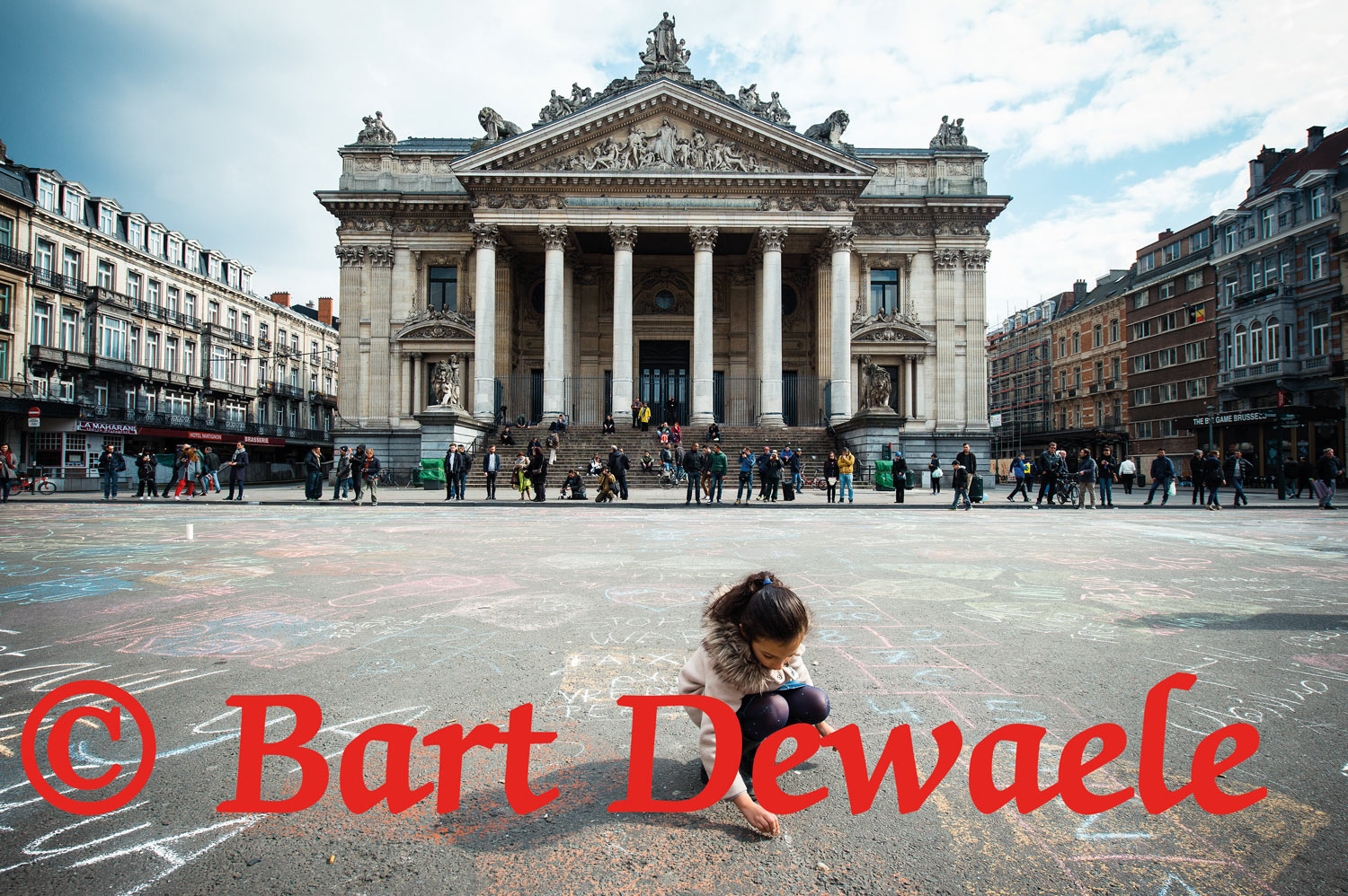 Op dezelfde dag nog van de aanslagen in Zaventem en Maalbeek stapte een vijftal vrouwen op het Beursplein van hun fiets. Ze begon met krijt boodschappen tegen terreur en haat te tekenen op het wegdek. Daarna nodigde ze omstaanders om mee te doen. Na een paar dagen stond het Beursplein vol met boodschappen van medeleven en hoop. Een tapijt van krijt. Een lichtpunt in de duisternis. Een hartverwarmende getuigenis van een land in rouw. Beeldverslag van freelance-persfotograaf Bart Dewaele (www.bartdewaele.com).