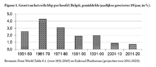 Bij ongewijzigd beleid voorspelt recent onderzoek aan de Universiteit Gent voor minstens de komende drie decennia een economische groei per hoofd van de bevolking lager dan 0,5% per jaar. Ons land beschikt echter wel over enkele beleidsopties om een periode van langdurige lage groei te proberen afwenden. Noodzakelijk hiervoor zijn structurele maatregelen (zoals een weldoordachte algemene hervorming van het pensioenstelsel), blijvende investeringen in infrastructuur en O&O en een drastische taks shift van belastingen op arbeidsinkomen (vnl. gericht op lager opgeleiden en ouderen) naar belastingen op inkomen uit vermogen. De maatregelen genomen door de huidige regering in het kader van de taks shift en de wijze waarop begrotingsonderhandelingen en -controles vandaag gebeuren, laten evenwel niet het allerbeste vermoeden.