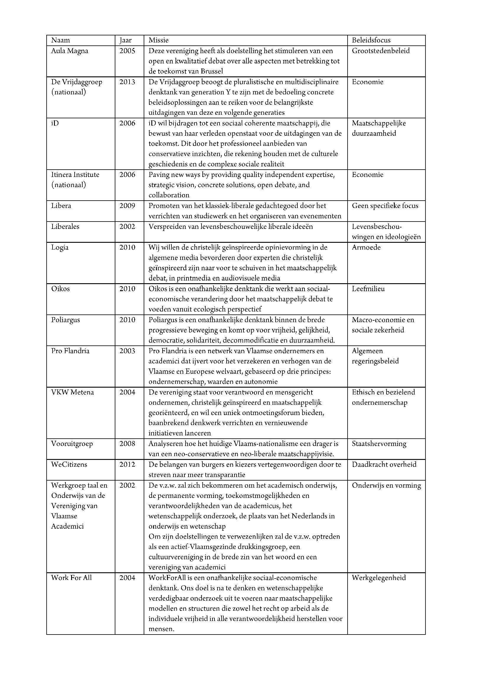 Als we kijken naar de missie van de denktanks, zien we een divers palet. Terwijl sommige van de organisaties focussen op concrete en soms zeer specifieke beleidsthema’s, zoals onderwijs (Werkgroep Taal en Onderwijs) of de toekomst van Brussel (Aula Magna), zetten andere een bepaalde politieke filosofie of ideologie centraal, bijvoorbeeld liberalisme (Libera en Liberales) of ecologie (Oikos), of zijn ze (mede) religieus geïnspireerd (zoals bijvoorbeeld Logia en VKW Metena). Uit onze survey bleek ook dat denktanks die sterk ideologisch geïnspireerd zijn eerder samenwerken met gelijkgezinde politieke partijen of belangenorganisaties. De erfenis van de verzuiling lijkt dus nog steeds aanwezig. In vergelijking met andere landen, zien we echter relatief weinig uitgesproken ideologische denktanks. Er is slechts een zeer beperkt aantal denktanks dat zich expliciet karakteriseert als ‘progressief’ of ‘conservatief’. Vooral op links zien we een schraal landschap. Er is enkel de Stichting Gerrit Kreveld, die in 1994 ontstond en vandaag de uitgever is van Samenleving en politiek. En recent ontstond de linkse denktank Poliargus, rond een groep voornamelijk Gentse academici. Wat de thematische beleidsfocus betreft, geeft Tabel 1 een gemengd beeld. Enerzijds bestrijken de bevraagde denktanks een zeer diverse set van beleidsdomeinen, anderzijds stellen we ook een sterke focus op economische thema’s vast.