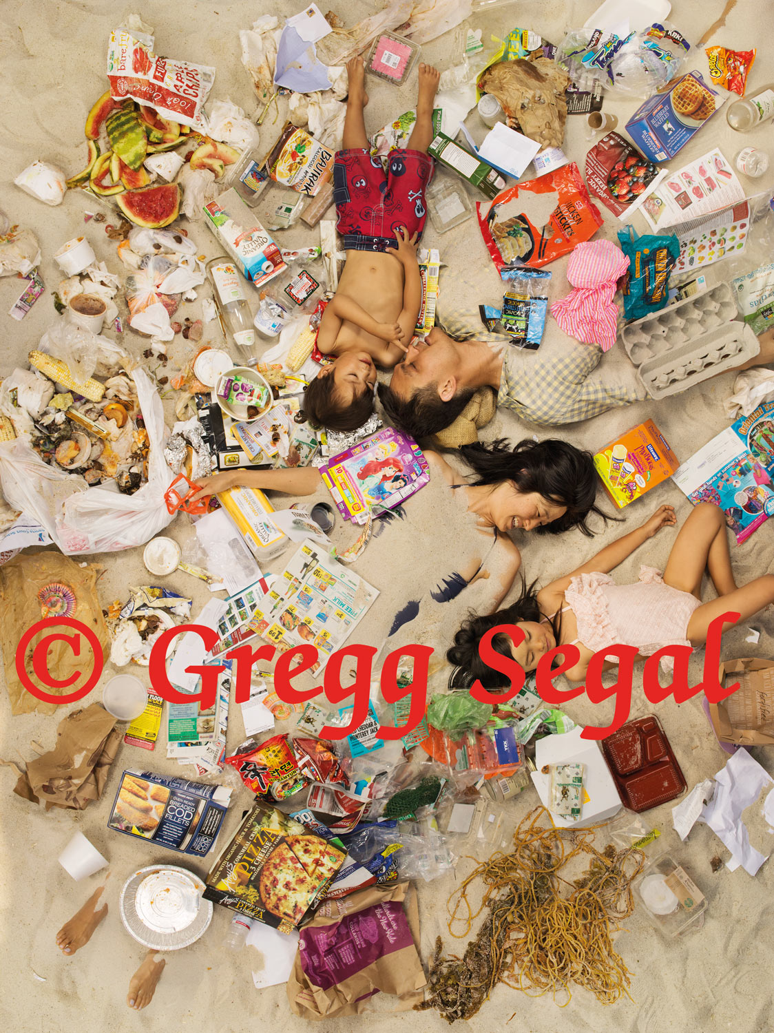 Als kind was fotograaf Gregg Segal (Pasadena, California) reeds gefascineerd door afval; waar het naartoe werd gevoerd en wat ermee gebeurde als er geen plaats meer was op de vuilbelt. Vandaag produceert de gemiddelde Amerikaan zo’n 13 kilo afval per week; op landelijke schaal goed voor een dikke 4 miljoen kilo afval per week. Het project ‘7 dagen afval’ probeert bewustzijn te creëren rond dat afvalprobleem. Gregg Segal fotografeerde mensen van alle leeftijden en sociale achtergronden in zijn tuin - in drie verschillende settings (water, strand, bos ) - omgeven door hun eigen afval van een week. Om zijn zoon van 8 jaar oud duidelijk te maken dat ook zij mee bijdragen tot het afvalprobleem, fotografeerde Segal ook zijn eigen familie, vrienden en buren. De foto’s uit deze reeks kunnen we catalogeren als ogenblikkelijke archeologie; een reliek van ons consumptiegedrag en onze waarden.