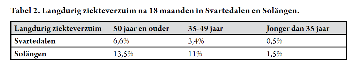 De verbeterde gezondheid van het personeel Svartedalen uit zich ten slotte in de lage cijfers voor langdurig ziekteverzuim (minstens 15 dagen). Vooral bij de groep 50-plussers is het effect uitgesproken. Bij die oudere werknemers ligt het ziekteverzuim na 18 maanden ongeveer op de helft van de cijfers in Solängen.
