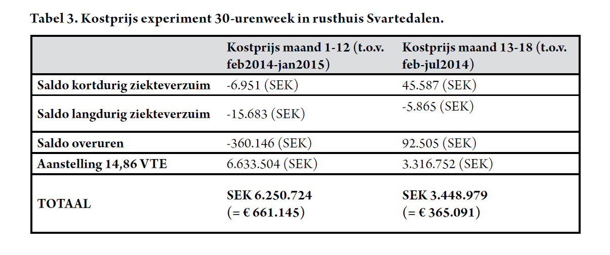 Enigszins tot mijn verbazing pakte Het Laatste Nieuws op 4 januari 2017 uit met de kop ‘Zweeds experiment met zesurige werkdag geflopt’.2 Nog voor een definitief evaluatierapport werd gepubliceerd, verklaarden bepaalde media de 30-urenweek al dood en begraven. Niets lijkt echter minder waar. Ondanks de kostprijs van het experiment, werden immers voor het verplegend personeel en de rusthuisbewoners uitsluitend positieve resultaten vastgesteld.