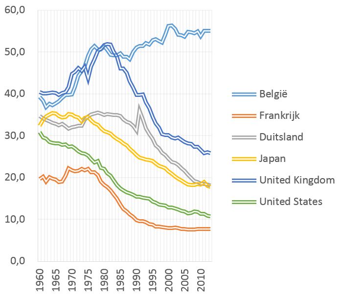 In de Belgische economie in zijn totaliteit nam het loonaandeel 'slechts' met 1% af, maar in de privésector lag het anders: daar nam het loonaandeel een duik van 4%. Nochtans staan we met een cao-dekkingsgraad van 95% bij de koplopers qua sociaal overleg en loopt de vergelijking maar tot 2014. Na deze datum volgden nog een loonblokkering en een indexsprong. Naar alle verwachting zal het loonaandeel dus verder dalen.
