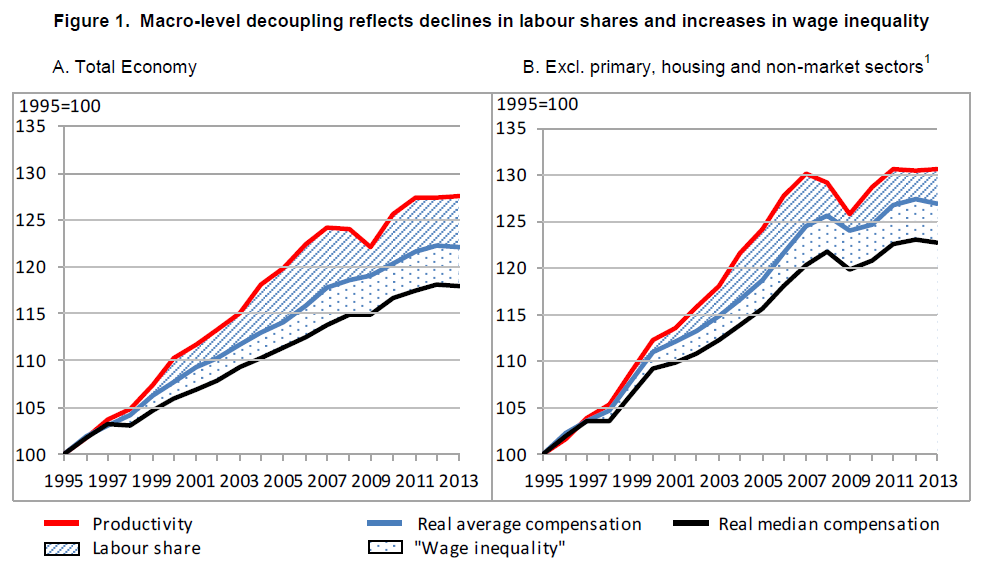 Even een recap: lonen moeten de productiviteit volgen. Wanneer de economie erop vooruitgaat, moeten de vruchten van die vooruitgang gelijk verdeeld worden onder werknemers en werkgevers. Of we riskeren sociale instabiliteit en erger. Het is wat onder de radar van de kranten gebleven, maar uit een recente studie1 van de OESO blijkt dat, wanneer de situatie in vierentwintig ontwikkelde economieën wordt bekeken, de lonen niet langer de productiviteit volgen.