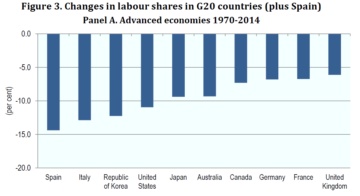 Grafiek 3. Veranderingen in het loonaandeel in de G20 (plus Spanje).