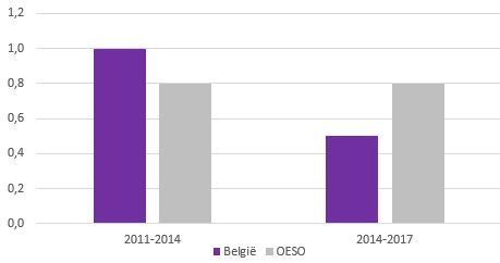 Tussen 2011 en 2014 werd de zwarte economie teruggedrongen van 17,1 tot 16,1% van het bbp, een afname met 1%-punt. De zwarte economie nam in die periode sterker af dan in de rest van de OESO (0,8%-punt). Tussen 2014 en 2017 werd slechts een daling van 0,5%-punt gerealiseerd, amper de helft van de daling tijdens de vorige legislatuur. En dat terwijl de dalende trend binnen de OESO, opnieuw 0,8%-punt, constant bleef (Figuur 3). De zwarte economie in België daalde tijdens deze legislatuur dus minder snel dan in de rest van de OESO.