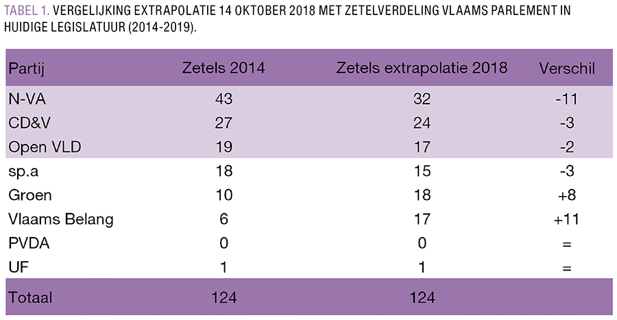 Simulaties van de parlementaire zetelverdelingen op basis van extrapolaties van 14 oktober 2018 tonen aan dat de Vlaamse regering in 2019 haar meerderheid nipt zou behouden en de federale regering haar meerderheid zou verliezen.