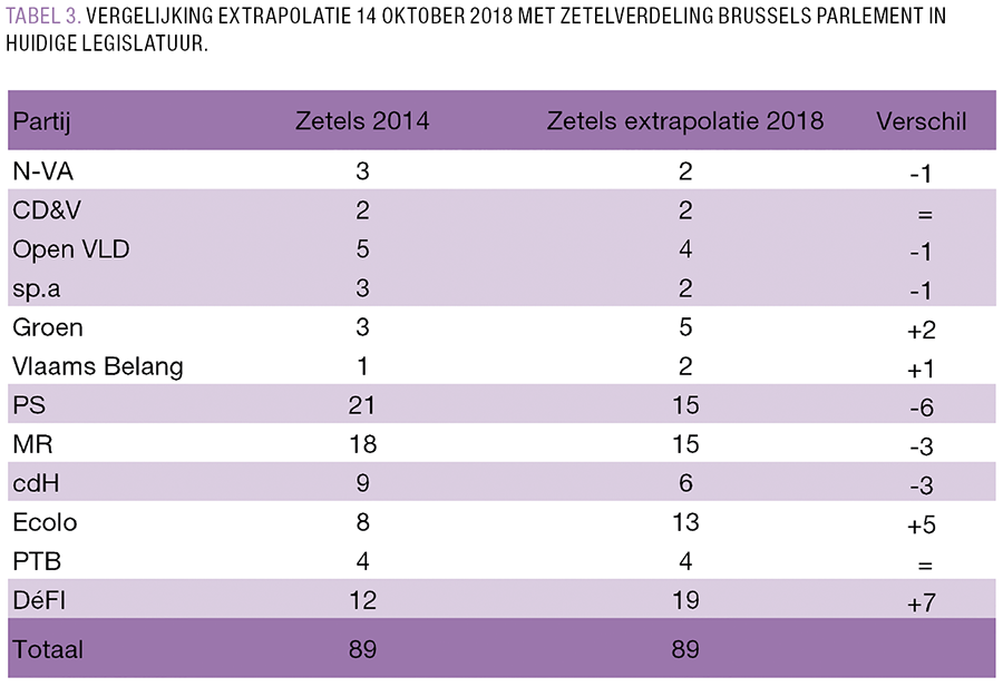 Tabel 3 toont de resultaten voor het Brussels Parlement. Binnen de Nederlandse taalgroep stijgt Groen van 3 naar 5 zetels. Het Vlaams Belang wint er 1 zetel bij. Hiertegenover staan N-VA, Open VLD en sp.a die elk 1 Brusselse zetel inleveren. Binnen de Franse taalgroep worden er 72 zetels verdeeld. De drie traditionele partijen verliezen samen 12 zetels. Vooral PS moet zwaar inleveren en zakt van 21 naar 15 zetels. Ecolo stijgt van 8 naar 13 zetels. DéFI zou 7 zetels bijkrijgen als gevolg van de algemene Waalse trend waarbij DéFI stijgt van 2,53% naar 4,62%. Bij de gemeenteraadsverkiezingen in Brussel deed DéFI het behoorlijk, met een aantal goede en minder goede uitslagen. Een bijna-verdubbeling in stemmen bij de volgende gewestverkiezingen – wat onze extrapolatie aangeeft – is echter niet erg realistisch. De winst van DéFi wordt overschat, maar het is onmogelijk om precies te weten hoe groot die overschatting is. Volgens onze berekening behoudt de huidige coalitie van PS, cdH, DéFi, Open VLD, CD&V en sp.a een meerderheid van zetels in het Brussels Parlement, maar haalt ze in de Nederlandse taalgroep slechts 8 op 17 zetels. Aangezien de Brusselse regering in beide taalgroepen een meerderheid nodig heeft, zou er alvast aan Vlaamse zijde naar een alternatieve coalitie moeten worden gezocht.