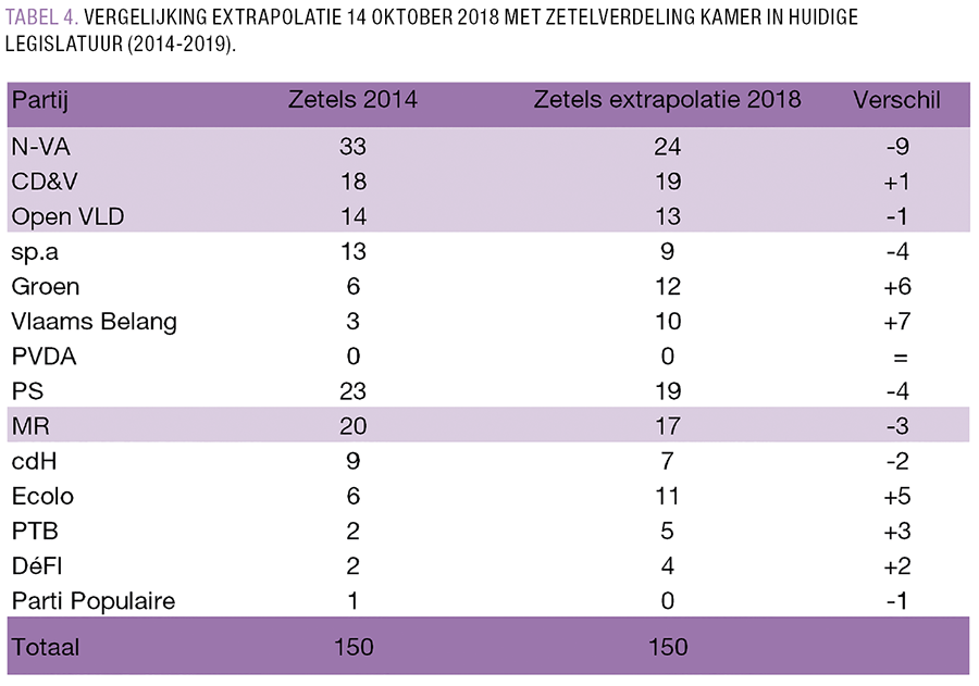 In Tabel 4 wordt de huidige zetelverdeling in de Kamer vergeleken met het resultaat van de extrapolatie. Wat opvalt is dat de verschuivingen zich over het algemeen binnen linker- en rechterzijde afspelen. Op links zien we dat de traditionele partijen, sp.a en PS, 4 zetels verliezen. De nieuwere partijen, Groen, Ecolo en PTB doen het daarentegen goed. Vooral Groen en Ecolo gaan er fors op vooruit; ze winnen respectievelijk 6 en 5 zetels. PTB krijgt er 3 zetels bij. Langs rechtse kant zien we de grootste verschuiving bij de Nederlandse taalgroep. N-VA verliest maar liefst 9 zetels, die voornamelijk naar Vlaams Belang lijken te gaan. Zij winnen 7 zetels. Bijgevolg verliest de huidige meerderheid van MR, N-VA, CD&V, Open VLD haar meerderheid.
