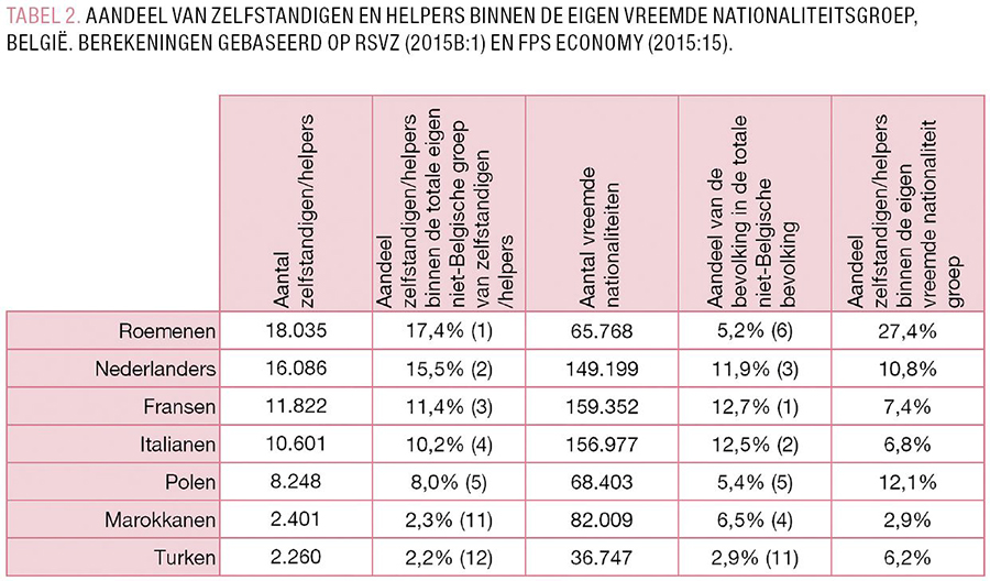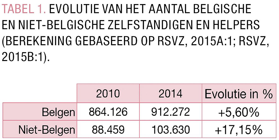 In België bedraagt het aandeel van zelfstandigen in het totaal aantal personen met een job (4,5 miljoen personen) zo'n 14% (664.000 personen) (FPS economy, 2016). Het aandeel van zelfstandigen in de bevolking tussen 15 en 64 jaar oud is 8,9%, wat beneden het EU-gemiddelde van 10,8% ligt. In vergelijking met de buurlanden is dit aandeel kleiner dan in Nederland (12,4%), maar groter dan in Duitsland (8,1%) en Frankrijk (7,5%). In Vlaanderen is het aandeel 9,9% (studiedienst Vlaamse Regering, 2015:141). Het aandeel van niet-Belgische werkgevers en helpers binnen het totale aantal werkgevers en helpers in België is 10,2% (103,630 personen), terwijl het aandeel niet-Belgen in de totale bevolking 11,2% bedraagt (Van den Broucke et al., 2015:80). Berekeningen op basis van data van de Vlaamse Migratie- en Integratiemonitor 2015 en RSVZ (Van den Broucke et al., 2015:80) en RSVZ (2015b:1), tonen aan dat het aandeel van zelfstandigen/ helpers in de totale Belgische bevolking (9,1%) hoger ligt dan het aantal zelfstandigen/ helpers in de totale niet-Belgische bevolking (8,2%). Desalniettemin kende het aantal niet-Belgische werkgevers en helpers een sterke stijging sinds 2010, van 88.459 in 2010 tot 103.630 in december 2014 (+17,15%). Terwijl in diezelfde periode de groei in absolute cijfers groter was onder Belgen (48.146, in vergelijking met 15.171 niet-Belgen), was de groei in percentage groter bij de groep niet-Belgen (17,5% in vergelijking met 5,6% bij Belgen).