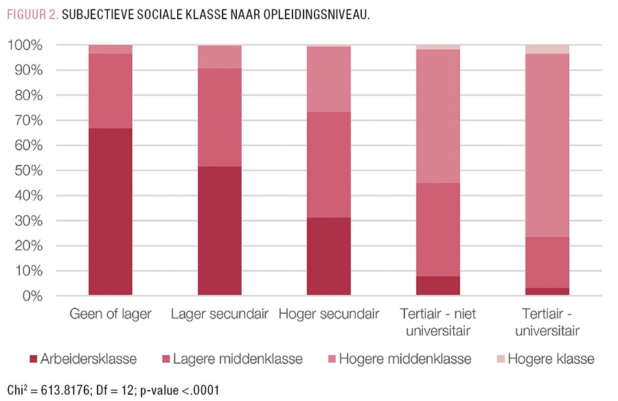 De band tussen subjectieve sociale klasse enerzijds en opleiding en beroepsgroep anderzijds is meer uitgesproken. Zo blijkt de meerderheid van de (on)geschoolde arbeiders en laaggeschoolden zichzelf te rekenen tot de arbeidersklasse, terwijl kaders en bedienden zichzelf in overgrote mate als middenklasse omschrijven. Treffend is dat het onderscheid tussen lage en hoge middenklasse heel sterk spoort met het opleidingsniveau: mensen met een hoger onderwijsdiploma voelen zich uitgesproken 'hogere middenklasse', terwijl mensen met een middelbaar diploma zich ofwel tot de 'lagere middenklasse' dan wel arbeidersklasse rekenen.
