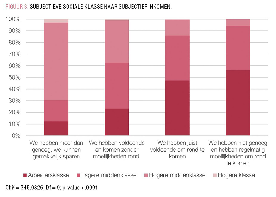 Uit onderzoek blijkt dat objectieve klasseposities (Klasse an sich) en subjectieve klasseposities (Klasse für sich) niet noodzakelijk overeenkomen. Een ruwe analyse van het structurele profiel van de zelfverklaarde middenklassers geeft enkele interessante inzichten. Iemands subjectieve klassepositie hangt weliswaar relatief sterk samen met diens inkomen, opleiding en beroep, maar dit verband is verre van perfect. Hoe hoger het inkomen, opleiding en beroepspositie, hoe groter de kans dat men zich tot een hogere sociale klasse rekent. Zo rekent bijna 90% van de rijkste Belgen (inkomensquintiel 5) zich tot de middenklasse, en dan vooral tot de hogere middenklasse. Wel is het opvallend dat ook ongeveer de helft van de laagste inkomensgroepen (quintiel 1 en 2) zichzelf ook als middenklasse catalogeert. Figuur 1 illustreert dat de subjectieve middenklasse op het vlak van inkomens relatief heterogeen is en al zeker niet eenduidig terug te brengen is tot de 'modale' inkomensgroepen.