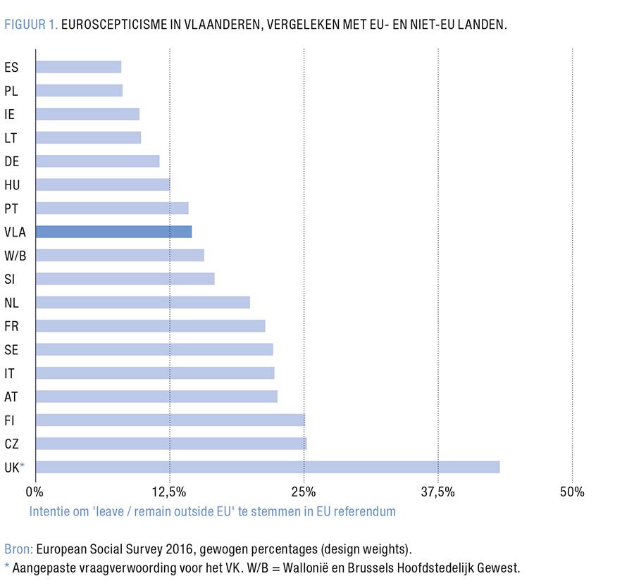 Vooreerst blijkt uit de European Social Survey 2016 dat Vlamingen – in vergelijking met inwoners van andere EU-landen – relatief positief staan ten opzichte van het EU-lidmaatschap. Slechts 15% van de Vlaamse respondenten geven aan dat ze in een referendum voor een 'opt out' zouden stemmen (Figuur 1). Dit cijfer is gelijkaardig in Franstalig België, maar opvallend lager dan in Nederland, Frankrijk en Italië. Naast buitenbeentje VK zijn Tsjechië en Finland de meest eurokritische landen, waar één op vier respondenten ervoor pleit om de EU te verlaten. Het ISPO Verkiezingsonderzoek laat dezelfde tendens zien. Zo is amper 14% van de Vlamingen het er mee eens dat België beter uit de EU zou stappen en beschouwt één op twee het EU-lidmaatschap als een goede zaak, terwijl een aanzienlijke groep van 38% het EU-lidmaatschap als noch goed, noch slecht aanziet.
