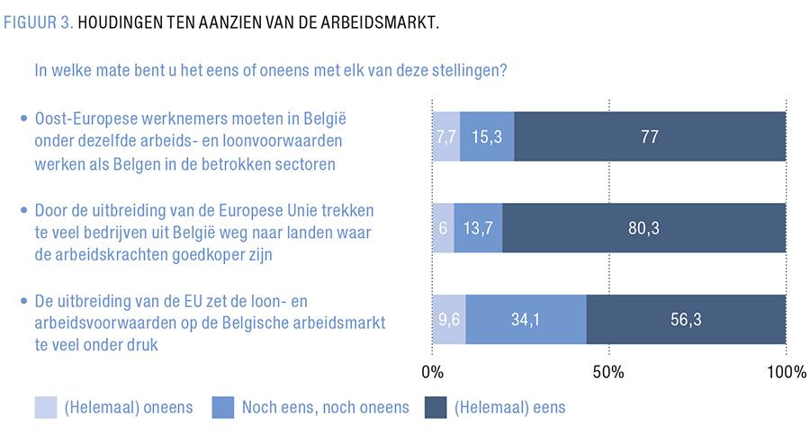 Uit onze gegevens blijkt dat nogal wat Vlamingen bezorgd zijn om de economische gevolgen van Europese integratie voor de Belgische arbeidsmarkt. Zo vindt 56,3% van het Vlaamse electoraat dat de loon-en arbeidsvoorwaarden te veel onder druk komen te staan door de uitbreiding van de EU. Driekwart van de Vlamingen is van mening dat Oost-Europese werknemers in België onder dezelfde arbeids- en loonvoorwaarden moeten werken als Belgen. De angst voor een verlies aan jobs wordt verder bevestigd, aangezien maar liefst acht op de tien Vlamingen aangeven dat de uitbreiding van de EU ertoe leidt dat te veel bedrijven België verlaten ten gunste van landen met lagere loonkosten.