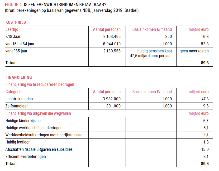 Bovenstaande concepten lijken een utopie. In ons huidig systeem zijn ze dat ook. In een situatie waar menselijke arbeid massaal overbodig wordt, zijn ze de evidentie zelve. Wanneer we een deel van het inkomen van de werkenden van vandaag zouden beschouwen als een virtueel evenwichtsinkomen dan is het systeem reeds betaalbaar (FIGUUR 4). De financiering via te recupereren bijdragen maakt namelijk een groot verschil. In deze berekening vervangen we het kindergeld door een vast maandelijks bedrag en behouden we de huidige pensioenregeling. De afschaffing van een aantal fiscale uitgaven (zoals de woonbonus) en de efficiëntieverbeteringen zijn zodanig gekozen dat de rekening klopt, maar zijn alleszins een haalbare kaart.