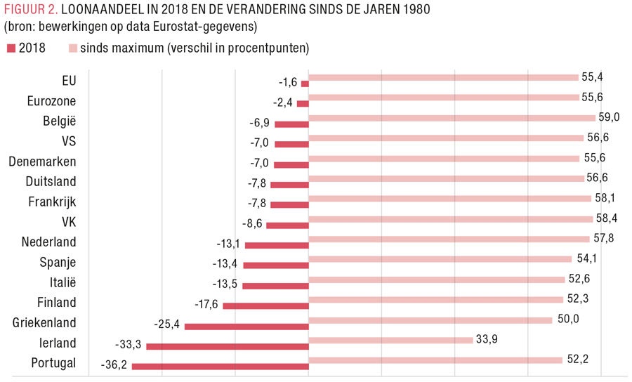 FIGUUR 2 toont aan dat het inkomen uit arbeid reeds enige tijd onder druk staat. Het loonaandeel is het deel dat arbeid (loontrekkenden en zelfstandigen) krijgt uit de jaarlijks gebakken welvaartskoek die we het bruto nationaal product noemen. Het complement is het winstaandeel. In 2018 bedroeg het loonaandeel voor België 59%; 6,9 procentpunten minder dan de maximumwaarde sinds 1980.
