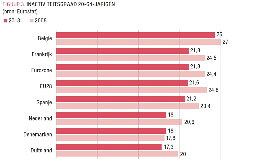 Laten we niet vergeten dat, ondanks onze recente puike arbeidsprestaties, de inactiviteitsgraad bij de bevolking op arbeidsleeftijd (20-64 jaar) nog steeds heel hoog ligt. FIGUUR 3 geeft aan dat deze inactiviteitsgraad in ons land niet alleen beduidend hoger ligt dan in de rest van Europa, maar dat ook de daling ten opzichte van 2008 minder omvangrijk is geweest dan we op het eerste zicht zouden denken.