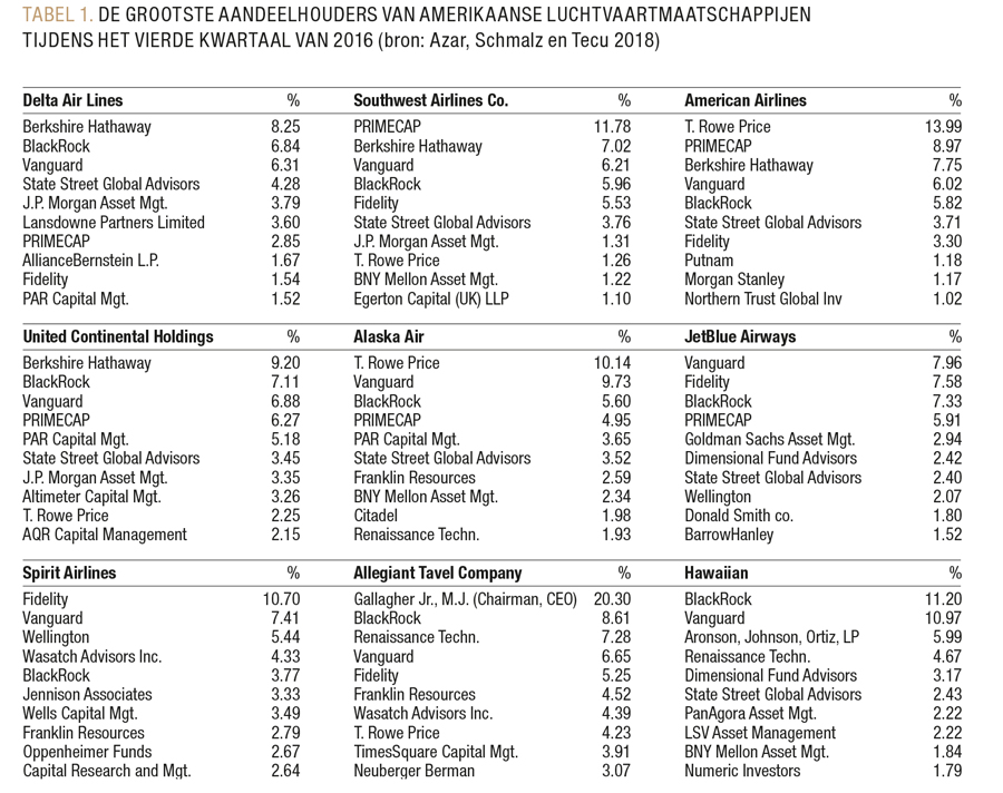 De hamvraag is: neemt common ownership bij concurrerende bedrijven nu echt de prikkels weg om te concurreren, met nadelige gevolgen voor consumenten? Azar, Schmalz en Tecu2 focussen op de Amerikaanse binnenlandse luchtvaartindustrie. Waar je zou kunnen verwachten dat deze industrie competitief is omdat luchtvaartmaatschappijen concurreren op dezelfde routes, tonen de auteurs aan dat de consument hiervan niet profiteert. Het aandeelhouderschap van de luchtvaartmaatschappijen is grotendeels in handen van institutionele beleggers (TABEL 1). In hun onderzoek over de relatie tussen common ownership en de prijzen van vliegtuigtickets vinden ze dat op routes waar er meer common ownership is de concurrentie afzwakt, waarbij de prijzen van vliegtuigtickets 3 tot 7% duurder zijn dan op andere routes. Ook ontdekken ze dat het aantal passagiers negatief gerelateerd is aan de verandering in common ownership, wat aangeeft dat de prijsstijgingen niet worden gedreven door een stijgende vraag.