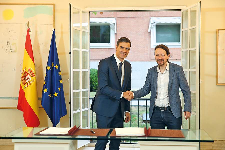 Podemos heeft vijf ministerposten. Pablo Iglesias is vicepremier en minister van Sociale Zaken, diens partner Irene Montero minister van Gelijke Kansen en Yolanda Díaz minister van Werk. Izquierda Unida levert Alberto Garzón (de eerste communist aan de macht sinds de Burgeroorlog) aan als minister van Consumentenzaken en de Catalaanse affiliatie van Podemos, En Comú Podem, de vermaarde socioloog Manuel Castells als minister van Universiteiten. Het zijn niet de zwaarste portefeuilles. De echte beslissingsmacht en de portefeuilles die beslissen over de centen zijn in handen van PSOE.