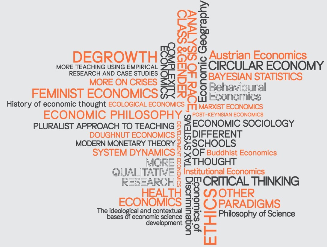 Heel wat elementen in de basiscursussen economie zijn gestoeld op het neoklassieke denken – economische agenten die zich rationeel en met exclusieve focus op eigenbelang gedragen, een sterk geloof in de vrije markt als motor van de economie, en een primaire focus op efficiëntie en economische groei. Binnen dit denkkader is het gebruikelijk om de economie als een losstaand systeem te zien dat losstaat van de natuurlijke omgeving waarbinnen ze opereert. De weinig realistische assumpties die aan de basis van liggen van het neoklassieke denken, laten toe om eenvoudige modellen te ontwikkelen waarbinnen het gedrag van economische agenten en hun interacties kunnen worden bestudeerd. Dit biedt een zekere houvast aan economen-in-spe en laat hen toe om zich vertrouwd te maken met enkele basistheorieën. Maar tegelijkertijd zijn deze modellen weinig bruikbaar om naar de belangrijkste uitdagingen van de 21e eeuw te kijken – toenemende ongelijkheden en het overschrijden van de ecologische draagkracht van onze planeet. Wanneer deze uitdagingen al een plaats krijgen in een basiscursus economie, worden ze beschouwd als ongewenste bijproducten – marktfalingen – van een systeem dat verder optimaal is. Oplossingen worden dan ex post gezocht waarbij de overheid tussenkomt in de markt om deze falingen te corrigeren, maar verder blijft de marktwerking overeind als basisprincipe in het neoklassieke denkkader.