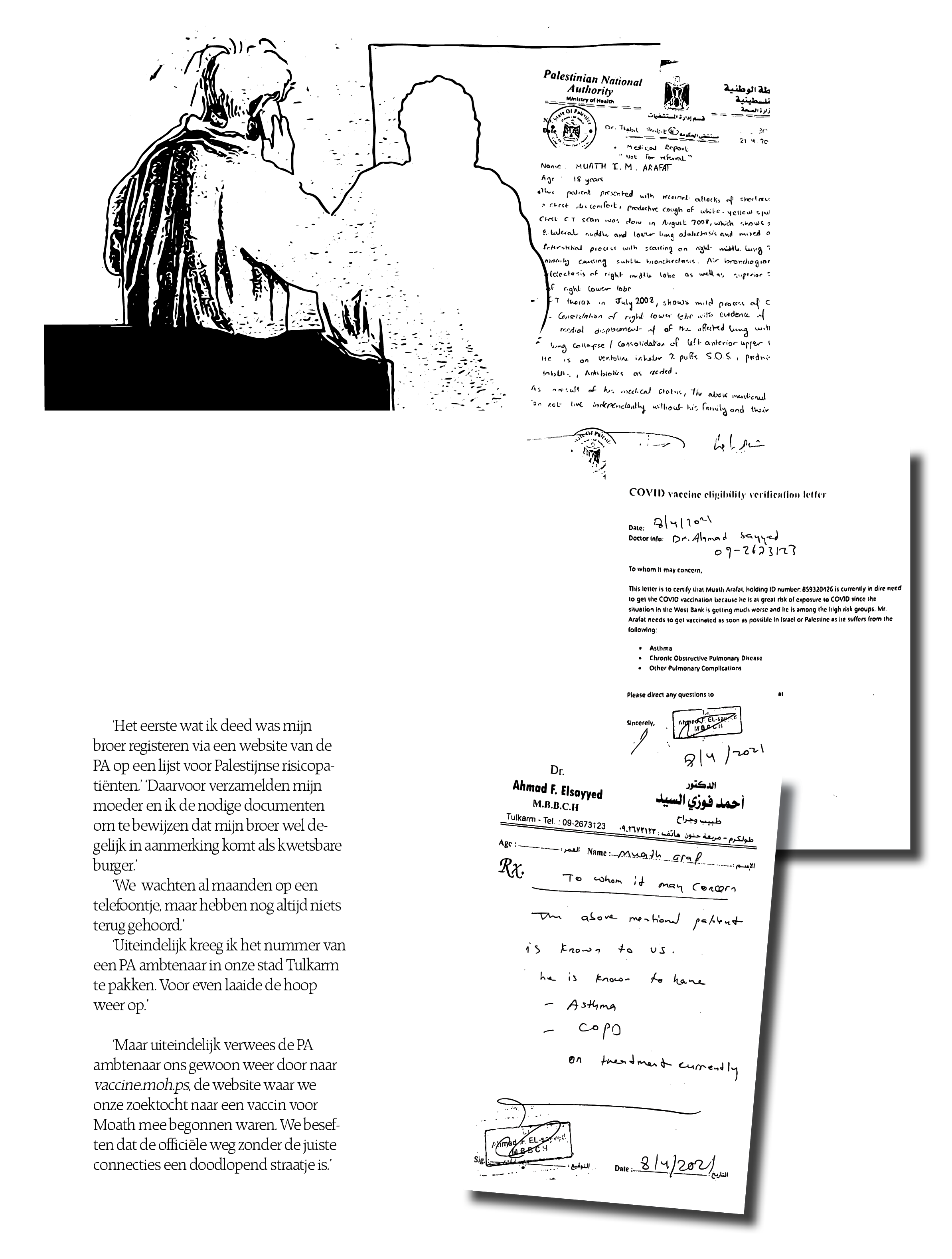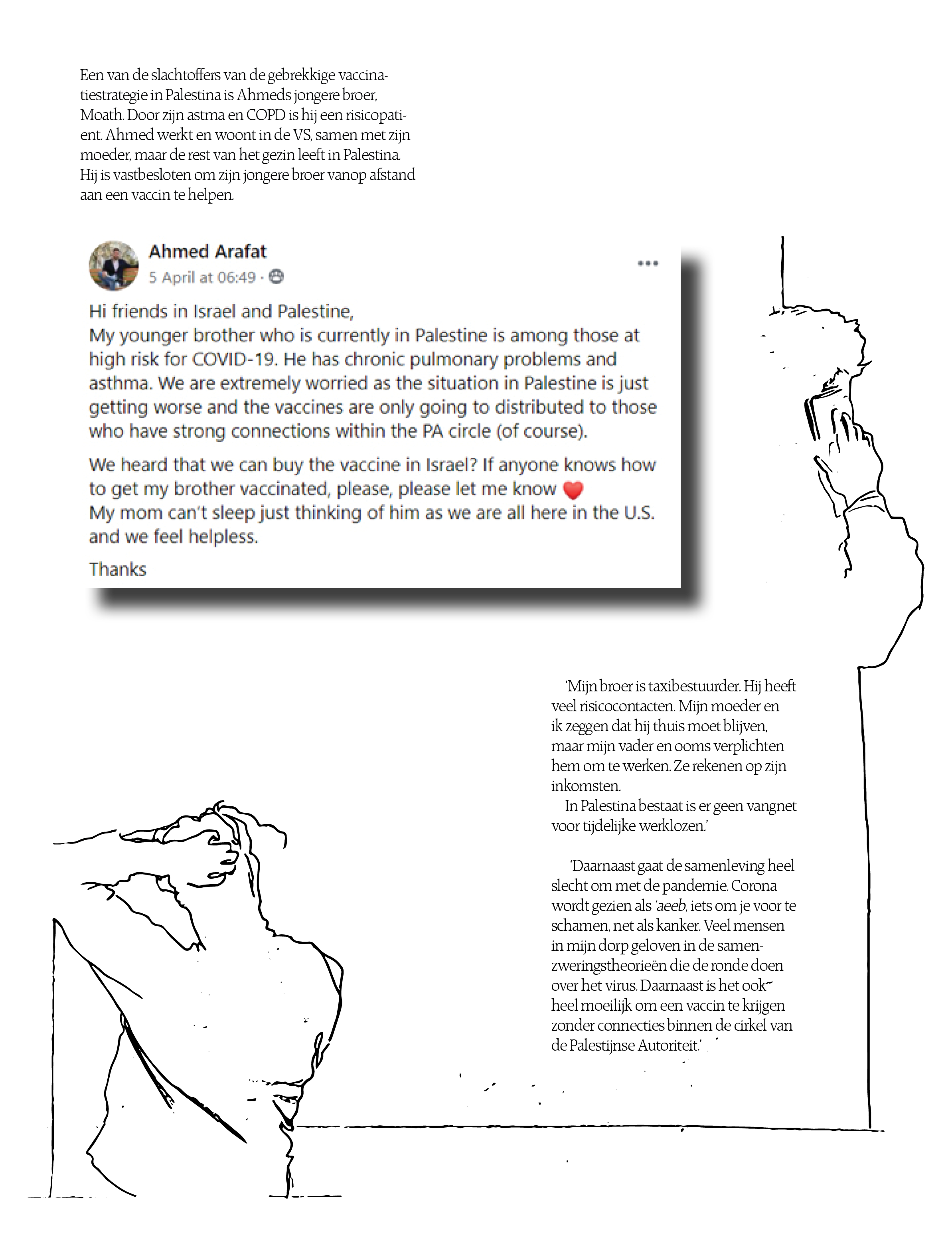 Eén van de slachtoffers van de gebrekkige vaccinatiestrategie is Ahmeds jongere broer Moath Arafat. Door zijn astma en COPD is hij een risicopatiënt. Ahmed werkt en woont in de Verenigde Staten, samen met zijn moeder, maar de rest van het gezin leeft in Palestina. Ahmed: 'Mijn broer is taxibestuurder. Hij heeft veel risicocontacten. Mijn moeder en ik zeggen dat hij thuis moet blijven, maar mijn vader en ooms verplichten hem om te werken. Ze rekenen op zijn inkomsten. In Palestina bestaat er geen vangnet voor tijdelijk werklozen.' Ahmed gaat verder: 'De samenleving gaat heel slecht om met de pandemie. Corona wordt gezien als aeeb, iets om je voor te schamen, net als kanker. Veel mensen in mijn dorp geloven in de samenzweringstheorieën over het virus die de ronde doen. Daarnaast is het ook heel moeilijk om een vaccin te verkrijgen zonder connecties binnen de cirkel van de Palestijnse autoriteit.'