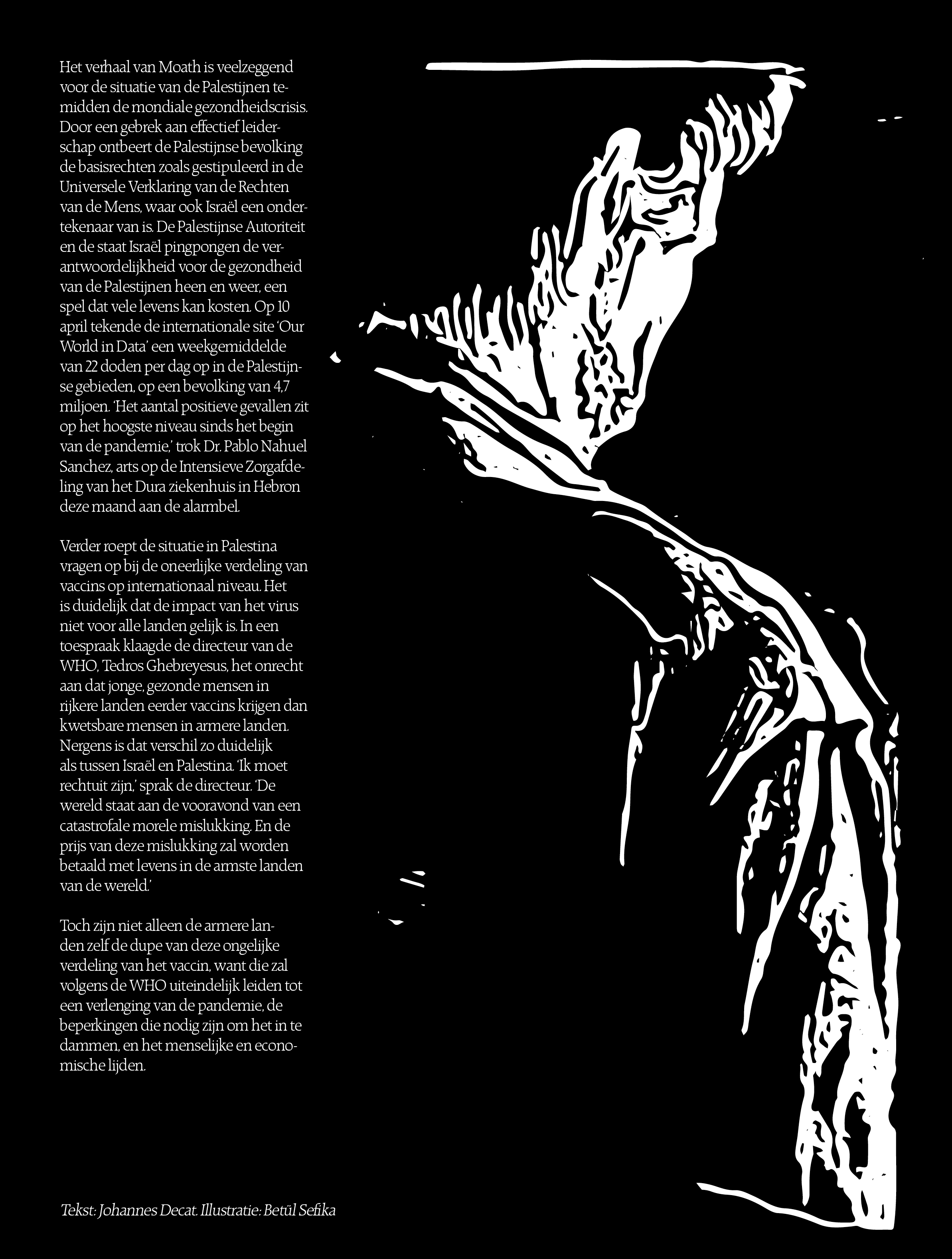 Het afgelopen jaar ontrolde Israël een razendsnelle vaccinatiecampagne voor zijn burgers. De internationale pers smulde van het mirakel en kroonde de staat tot 'Wereldkampioen Vaccineren'. Terwijl in Israël het openbare leven weer is opgestart, heeft het virus echter vrij spel in de Palestijnse gebieden. De laatste weken haalde de regio het nieuws door het dodelijke en volgens velen disproportionele Israëlische geweld op de Palestijnse bevolking in de nasleep van de protesten tegen de uithuiszettingen in Oost-Jerusalem, een drama dat zich afspeelt tegen een achtergrond van 's werelds grootste vaccinatieongelijkheid.