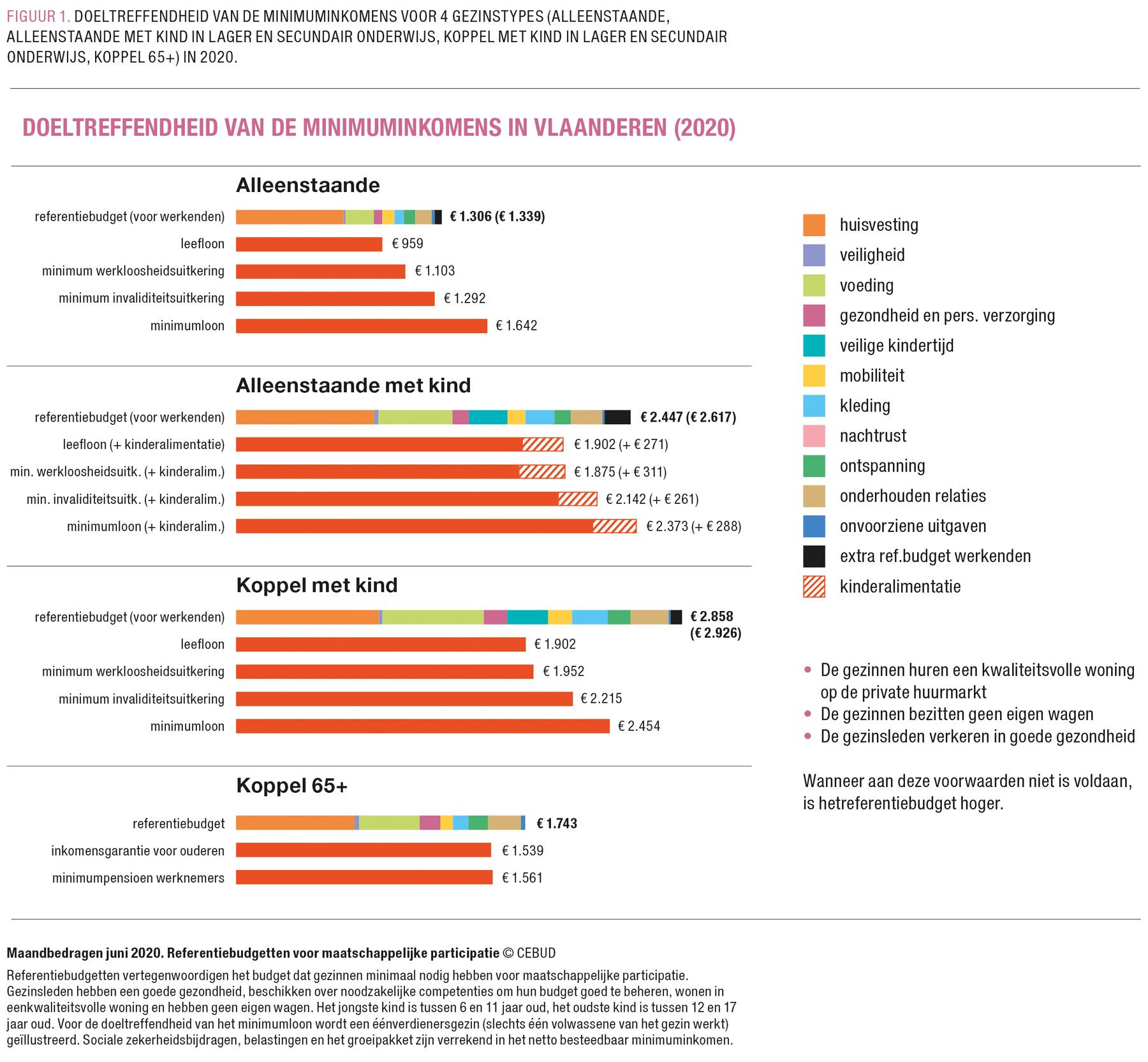 De Belgische referentiebudgetten1, die sinds 2008 worden opgemaakt door CEBUD (Centrum voor budgetadvies en -onderzoek), vullen deze leemte op. Referentiebudgetten zijn geprijsde korven van goederen en diensten die, op basis van wetenschappelijk onderzoek, een antwoord geven op de vraag hoeveel inkomen een gezin minimaal nodig heeft om volwaardig aan de samenleving deel te nemen. Het antwoord op deze vraag is voor elk gezin anders en afhankelijk van individuele noden van het gezin. Zo resulteert een slechte gezondheidstoestand vaak in bijkomende financiële noden. Ook kenmerken van de maatschappij, zoals de betaalbaarheid van onderwijs, energie en openbaar vervoer, geven aanleiding tot verschillende financiële noden.