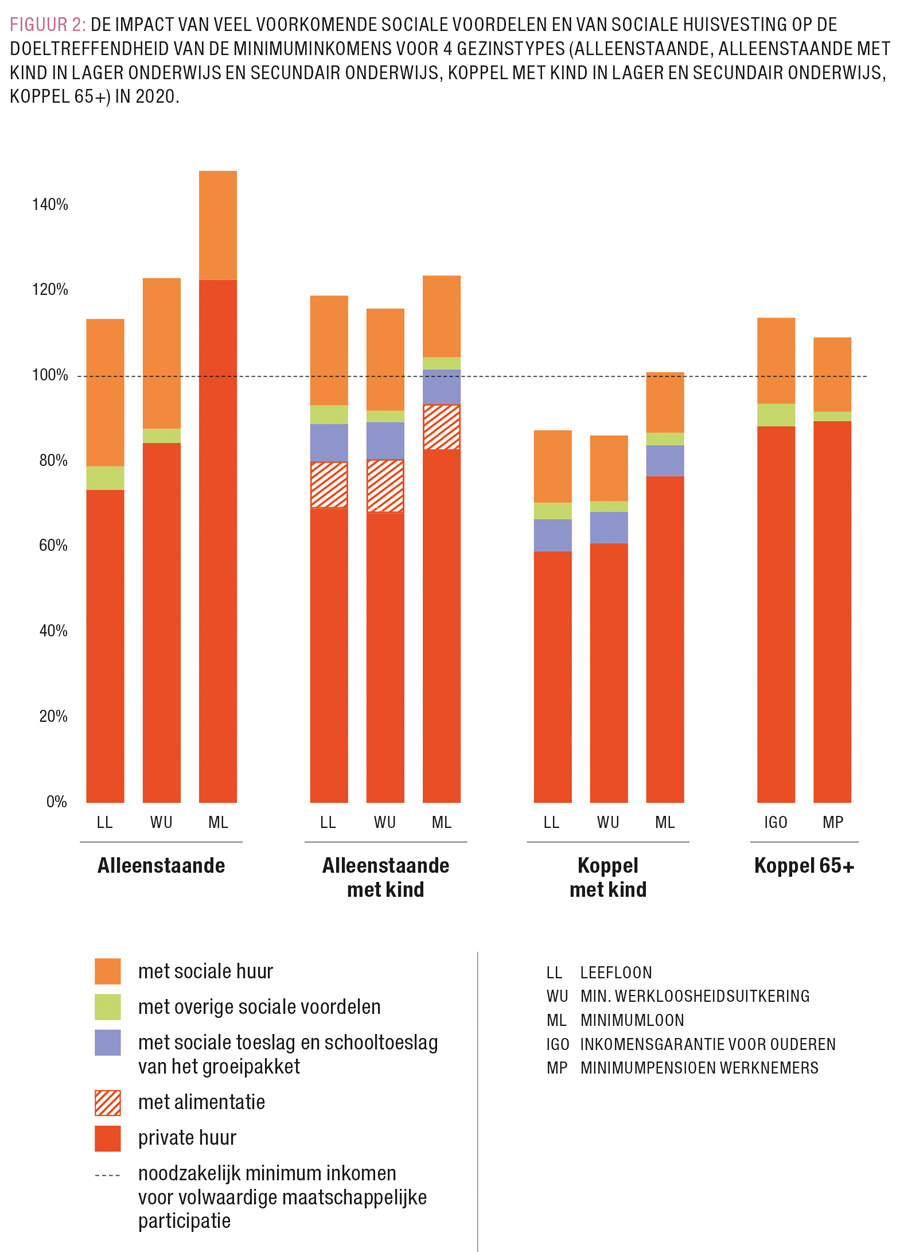 Wanneer de gezinnen bovenop de sociale voordelen het geluk hebben om een sociale woning te kunnen huren, zullen de minimuminkomens voor de meeste onder hen wel (nipt) voldoende zijn om menswaardig te leven. Dit geldt niet voor koppels met kinderen in het lager of secundair onderwijs die leven van een leefloon of minimum werkloosheidsuitkering. Voor hen blijven deze uitkeringen ontoereikend.