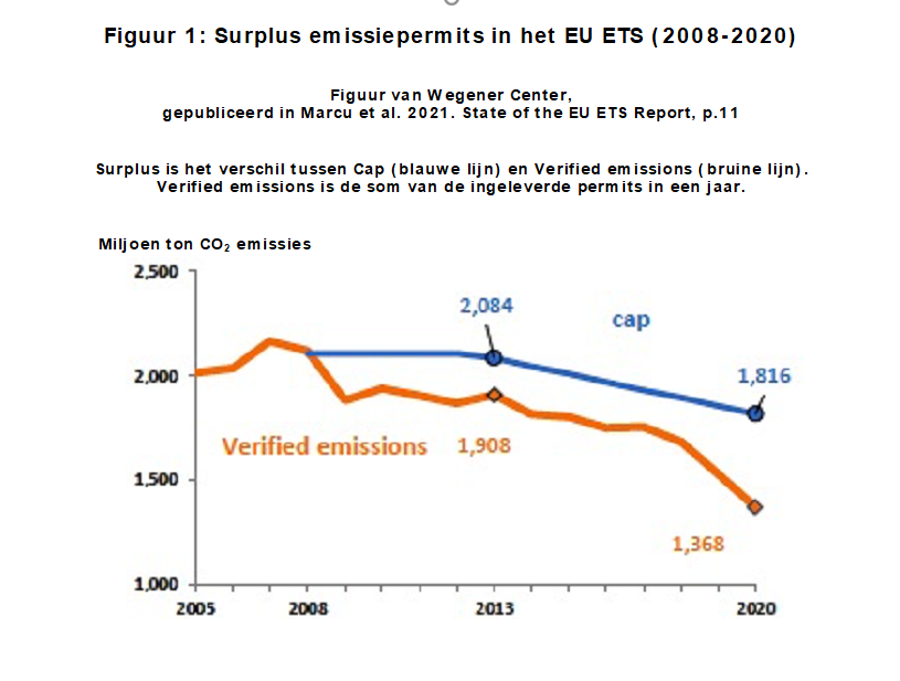 De praktijk, echter, is dat sinds de start van EU ETS in 2005 de jaarlijkse Caps veel te ruim zijn door het uitdelen van gratis permits, nog verruimd door de financiële crisis in 2008 en door Covid in 2020, buiten het ETS ontwikkelde technologie van windturbines, fotovoltaïsche panelen (PV), en anderen. De Caps zijn poreus door de import van permits uit niet-EU-landen en door de koolstoflekken via Europa's de-industrialisering. Jaar na jaar overschrijdt de Cap ruim het totaal van de feitelijke emissies (FIGUUR 1) Dat ETS Cap de emissies van de industrie zou beknotten, is dus een fabel.
