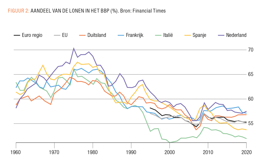 Een dergelijke situatie kenden we in de decennia na de Tweede Wereldoorlog. Lonen (en arbeidsvoorwaarden) stegen mee met de prijzen en de productiviteit, waardoor de winstmarges van bedrijven constant bleven, of zelfs daalden (FIGUUR 2). Wat er sindsdien is veranderd, is niet een plotse afname van de concurrentie waardoor oligopolisten ineens meer winst konden maken, maar een (georganiseerde) afkalving van de vakbondsmacht, waardoor de lonen niet meer meestegen met de inflatie en/of de productiviteit. Het resultaat is de situatie waar we nu in zitten: torenhoge winsten bij het bedrijfsleven, stijgende ongelijkheid en een dalend aandeel van de lonen in de economie. Wanneer bedrijven de macht hebben om de prijzen te laten stijgen, moeten werknemers die macht balanceren en vechten voor hogere lonen.