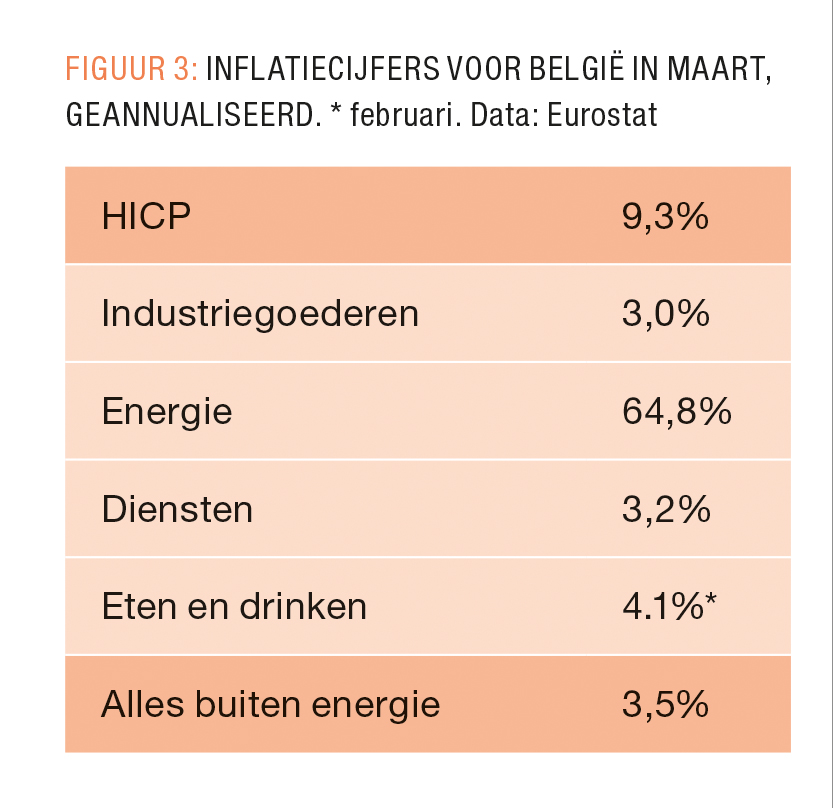 En dat is precies wat er nu aan de hand is. De index stijgt met meer dan 9%. Historisch, wordt er gezegd. Catastrofaal, wordt er gezegd. Maar wanneer we kijken naar wat er schuilt achter die index krijgen we een ander en genuanceerder beeld van wat er gaande is. De grootste drijver van de hoge inflatie blijft veruit de component energie (FIGUUR 3). Daar stijgen de prijzen met 65%, wat de algemene index natuurlijk de hoogte induwt. Wanneer we een index bekijken zonder deze component energie blijft de prijsstijging beperkt tot 3,5%. Dat lijkt redelijk veel, maar is geen reden tot paniek. De prijs van diensten stijgt met 3,2%, terwijl die van voeding en industriegoederen stijgt met 3%, wat vooral te wijten is aan de oorlog enerzijds en de blijvende problemen in aanvoerketens als gevolg van de pandemie anderzijds. Sommigen prijzen stijgen zelfs helemaal niet, zoals Telecommunicatie, Educatie en Gezondheid, en sommige dalen zelfs, zoals die van het Openbaar vervoer. Inflatie is niet universeel, maar contextueel. Ook ons antwoord op inflatie moet dus specifiek zijn.