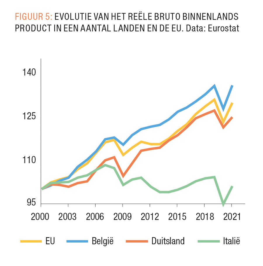 De rente verhogen zal onze afhankelijkheid van fossiele energie niet verlagen, noch zal het de wielen van onze aanvoerketens smeren. Integendeel, het verhoogt de kost van investeringen in energiezuinigheid (isolatie, warmtepompen, energie-efficiëntere productieprocessen), hernieuwbare energieopwekking en herlokalisering van de productieketens. Bovendien zou een renteverhoging dramatische gevolgen hebben voor Zuid-Europese landen, die veel kwetsbaarder zijn voor renteschommelingen. De rente verhogen zou zelfs kunnen leiden tot een heruitgave van de eurocrisis, omdat de Europese economie het eigenlijk helemaal niet zo goed doet (FIGUUR 5). We zijn nog lang niet hersteld van de coronacrisis en sommige landen zelfs nog niet van de eurocrisis. Mocht de ECB niet al de gaspedaal volledig ingedrukt hebben, zou ze op dit moment zelfs een tandje moeten bijsteken. En zeker niet op de rem gaan staan.
