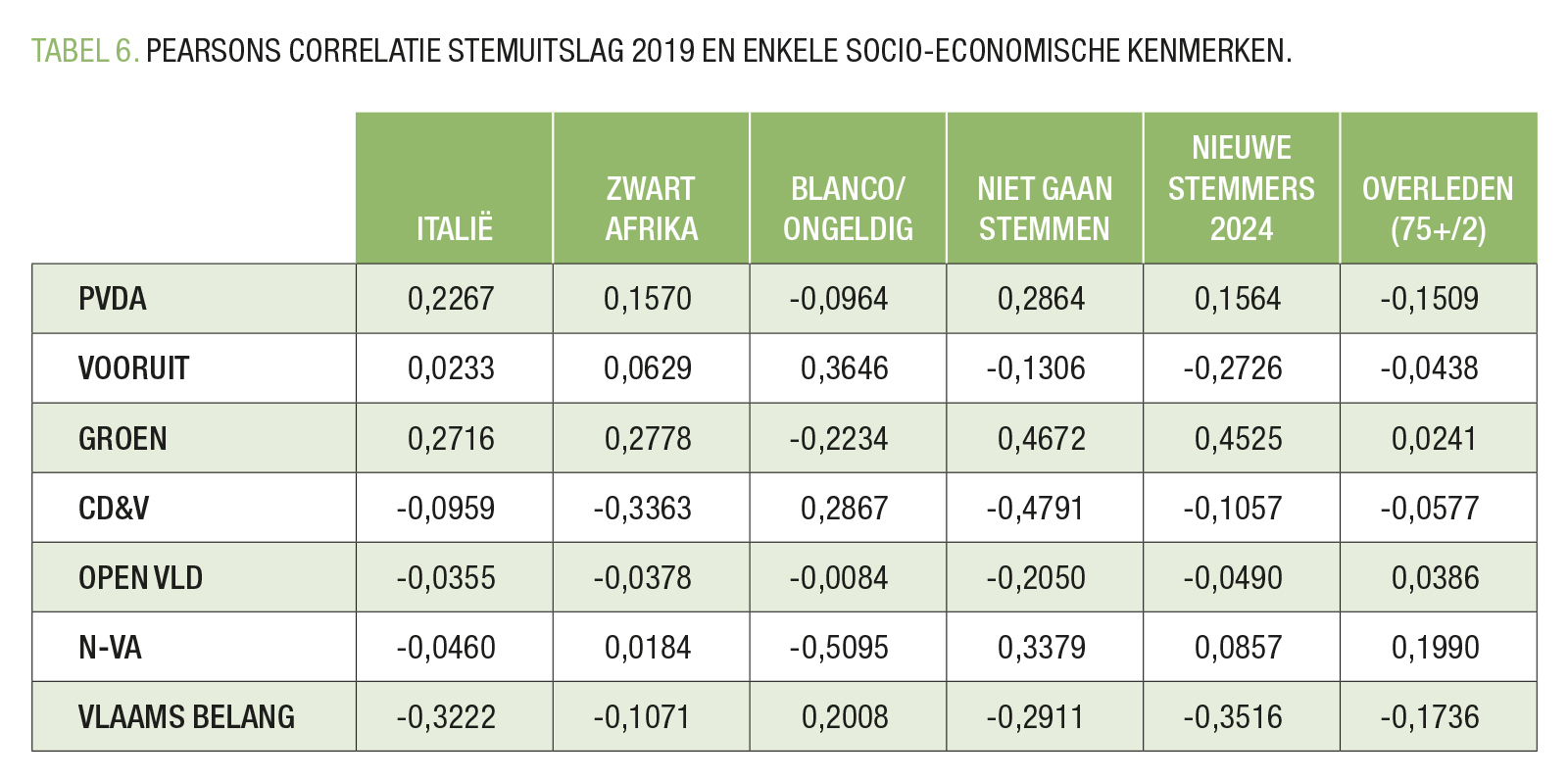 De sterkste correlatie die in TABEL 5 wordt vastgesteld, is deze van het percentage van de 18-64-jarigen die een RVA-uitkering genieten zonder beschikbaar te zijn om te werken – diegenen die Vlaams Belang nog al eens vlug de 'profiteurs' van de sociale zekerheid noemt en daarmee de inwoners met migratieachtergrond bedoelt (die, in tegenstelling tot wat rechts en extreemrechts denken, wél beschikbaar zijn voor de arbeidsmarkt). Ook gemeenten met een hoog percentage werkend in industriële sectoren, bouw en energie matchen met een stem voor Vlaams Belang. Arbeidersgemeenten tonen geen verband met een stem voor PVDA. In gemeenten met een hoger percentage moslims wordt wel in meerdere mate voor PVDA gestemd. In dezelfde lijn correleert stemmen voor PVDA met een hoger percentage inwoners met niet-Europese migratieachtergrond en Belg geworden vreemdelingen. Groen matcht niet met arbeiders; ze moet het hebben van hoger opgeleiden en bedienden uit de tertiaire sector. N-VA is de partij met het meest verschillende publiek, zonder verband met Belgen met Belgische achtergrond (die wel sterker terug te vinden zijn bij Vlaams Belang). Gemeenten waar meer dan elders Italianen wonen, scoren lager voor Vlaams Belang. En CD&V heeft een lager kiesresultaat in gemeenten met inwoners uit zwart-Afrika.