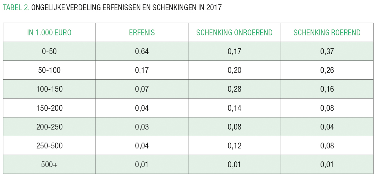 TABEL 2 tabel toont dat kleine erfenissen erg vaak voorkomen: maar liefst 64% van de begunstigden ontving in 2017 een bedrag kleiner dan 50.000 euro. Schenkingen van onroerende goederen zijn gemiddeld het grootst. Schenkingen zijn een alternatief voor erfenissen en dragen meer bij tot overerving van vermogensongelijkheid dan erfenissen. Het lijkt dan ook logisch dat zij beiden samen moeten worden beschouwd in de discussie rond overerving van vermogensongelijkheid en de rol die belastingen kunnen spelen.