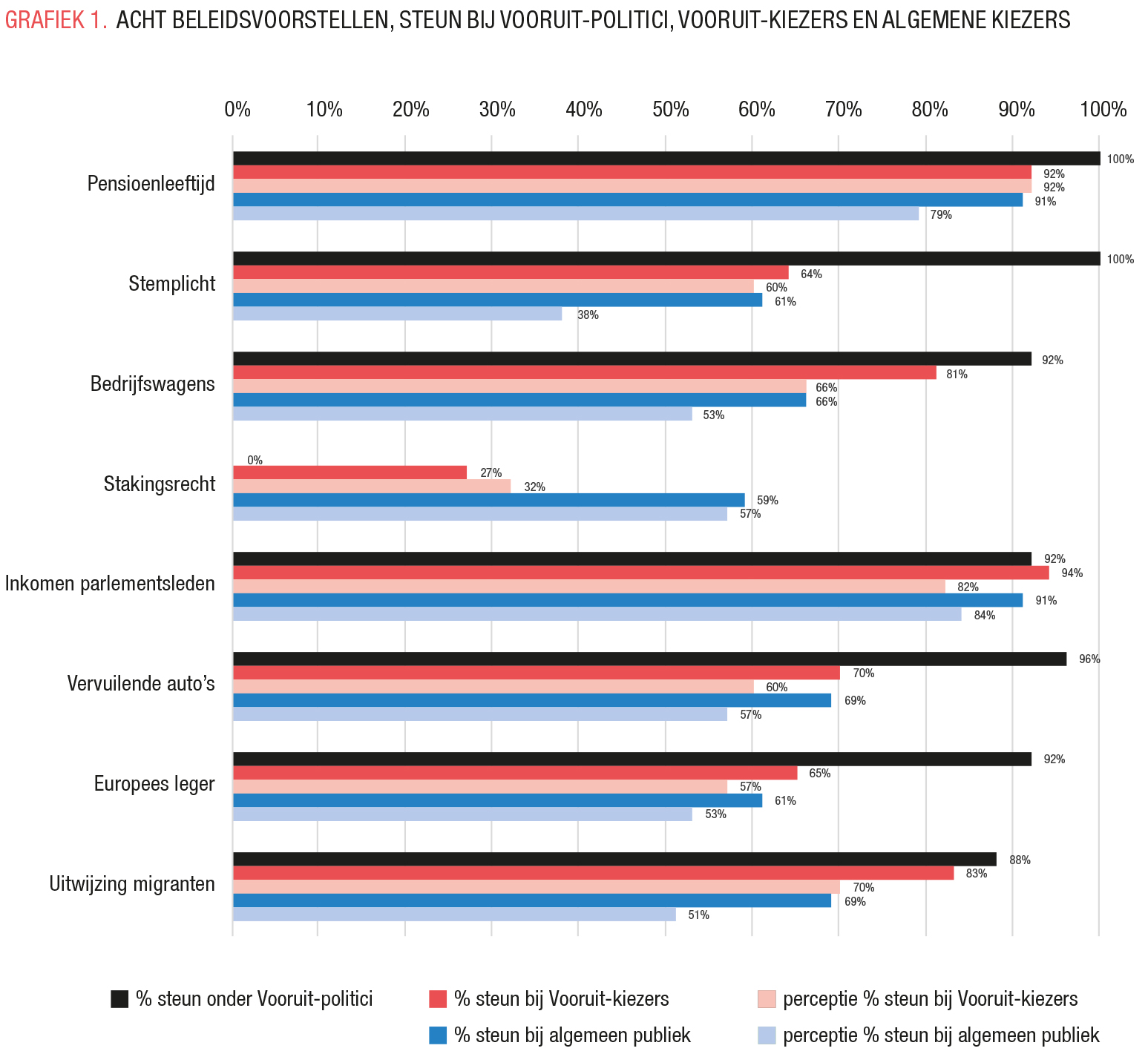 Aan ons onderzoek in het voorjaar van 2018 namen 26 Vooruit-politici deel, allemaal Vlaamse of nationale parlementsleden of partijleider – 81% van de Vooruit-politici beantwoordde dus onze vragen. We vroegen die politici eerst naar hun eigen mening over acht specifieke beleidsvoorstellen; we nemen aan dat de eigen mening van de politici hun ideologie weerspiegelt. Daarna vroegen we naar hoeveel percent van de Vlaamse kiezers in het algemeen en van hun eigen partij-electoraat die voorstellen steunt, dat is onze meting van de perceptie van de publieke opinie. Parallel daarmee deden we een bevraging onder de Vlamingen (waaronder Vooruit-kiezers), die we naar hun eigen mening over de acht voorstellen vroegen. Door de perceptie van de werkelijke opinie af te trekken, gaan we na hoe sterk en in welke richting de percepties van politici van de realiteit afwijken. Er kan worden gediscussieerd over de representativiteit en de verwoording van de acht beleidsvoorstellen, maar dit waren ze: (1) De pensioenleeftijd mag niet verder stijgen dan 67 jaar, (2) Bedrijfswagens moeten zwaarder worden belast, (3) De opkomstplicht moet behouden blijven, (4) Het stakingsrecht moet worden ingeperkt, (5) Alle inkomsten van elk parlementslid moeten jaarlijks bekend worden gemaakt, (6) In steden moeten de meest vervuilende wagens verboden worden, (7) België mag nooit iemand uitwijzen naar een land waar mensenrechten geschonden worden, (8) Nationale legers zouden vervangen moeten worden door één Europees leger. De eerste vier (pensioenleeftijd, bedrijfswagens, stakingsrecht, opkomstplicht) zijn typische economische links-rechts-thema's, de laatste drie (vervuilende wagens, migranten, Europees leger) zijn sociaal-cultureel links-rechts.