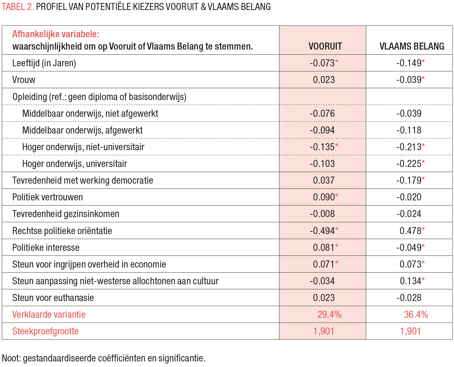 In hoeverre hebben, tot slot, potentiële kiezers van Vlaams Belang en Vooruit een gelijkaardig profiel? Ik rapporteer hiertoe resultaten van een regressieanalyse (TABEL 2). Positieve coëfficiënten wijzen op een positief verband en negatieve coëfficiënten op een negatief verband tussen de waarschijnlijkheid om voor respectievelijk Vooruit/Vlaams Belang te stemmen en de verschillende verklaringsgronden. Enkel verbanden aangeduid met een asterisk (*) zijn statistisch significant, d.w.z. onwaarschijnlijk te wijten aan toeval. Wat blijkt? Vrouwen zijn minder geneigd om voor Vlaams Belang te stemmen, en zowel Vooruit als Vlaams Belang trekken jongere kiezers aan. Kiezers met een hoger opleidingsniveau zijn minder geneigd voor Vlaams Belang en Vooruit te stemmen, vergeleken met kiezers zonder diploma of diploma basisonderwijs. Verder verschillen beide groepen sterk: vertrouwen in de politiek, tevredenheid met de werking van democratie in België, een linkse politieke oriëntatie en politieke interesse houden positief verband met de waarschijnlijkheid om op Vooruit te stemmen en vice versa voor Vlaams Belang. Als we twee sociaal-culturele stellingen (steun voor euthanasie en aanpassing niet-westerse allochtonen aan de cultuur) en een sociaal-economische stelling (regulering economie) bekijken, valt op dat de steun voor overheidsingrijpen in de economie positief correleert met kiesintenties voor beide partijen. Steun voor de aanpassing van niet-westerse allochtonen aan de cultuur houdt positief verband met grotere waarschijnlijk voor Vlaams Belang te stemmen.
