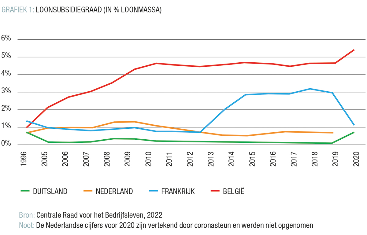 In de eerste plaats gebeurt dat via loonsubsidies. Over de hoge lasten op arbeid hoor je vaak spreken, maar over de compenserende subsidies veel minder. In België worden de loonkosten verlaagd door allerlei subsidies: nachtwerk, overuren, ploegenarbeid, R&D, enzovoort. In 2020 bedroegen deze loonsubsidies meer dan 9 miljard euro. De loonsubsidies zijn de zwaarste economische steun die in België wordt gegeven. In de buurlanden bestaan ze amper of veel minder, zoals GRAFIEK 1 uit de Sociaal-Economische Barometer ABVV 2022 illustreert.