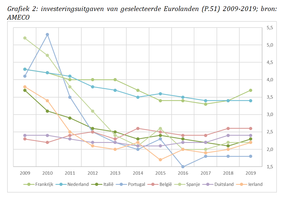 Maar dat bracht weinig zoden aan de dijk. Hoewel de begrotingsregels hun effect op het gedrag van de lidstaten niet hebben gemist, werd de eigenlijke doelstelling niet bereikt. Tussen 2009 en 2019 daalde de schuldenlast van de lidstaten slechts met gemiddeld 3%, ondanks alle besparingen (Grafiek 1). De groei vertraagde veel sterker. Als iedereen tegelijkertijd begint te saneren, krimpt de vraagzijde van de economie in. De uitgaven van één sector in de economie (de overheid) zijn immers de inkomsten van de andere (gezinnen, bedrijven en het buitenland). Aangezien bijna alle lidstaten gelijktijdig begonnen te besparen, werd de recessie verergerd. Bovendien werd een groot deel van die besparingen gezocht bij investeringen (Grafiek 2). De uitgaven voor nieuwe wegen, sporen, of scholen werden teruggeschroefd. Die uitgaven zijn de groei van morgen. Voor alle duidelijkheid: dat is niet omdat regeringen perfide zijn. Ze deden exact waar de regels hen toe dwongen: kortetermijndenken. De begrotingsregels waren zo een perfect recept om toekomstige groei te vernietigen. Zo daalden de Europese publieke investeringen tussen 2009 en 2013 met bijna 1% van het bbp: meer dan 110 miljard.