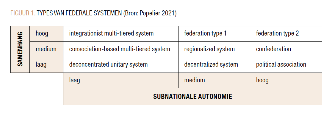 In werkelijkheid gaat federalisme over meer dan dat. In federale theorie is iedereen het erover eens dat samenhang cruciaal is.6 De bekendste vertaling daarvan is 'federale loyauteit'. Tot recent werd dat niet in de definitie van federalisme vertaald. Dat komt door het Amerikaanse overgewicht op de federale theorievorming, en vooral het oorspronkelijke, duale model daarvan. Door samenhang op te nemen in de definitie, vat men beter de essentie, en is ook meer nuance mogelijk. Een federaal systeem is dan een politiek systeem met verschillende territoriale bestuurslagen, op zoek naar een steeds wijzigend evenwicht tussen samenhang en autonomie.7 Autonomie gaat over de mogelijkheid voor deelgebieden om zichzelf te organiseren, zelf beleid te voeren en hun belangen te beschermen in centrale besluitvorming. Samenhang gaat over de integriteit van het systeem, dat rekening houdt met zowel de belangen van de deelgebieden als een overkoepelend belang, op basis van solidariteit en wederzijds respect. De mate waarin autonomie en samenhang in de instellingen gegoten wordt, is de federale balans. Dat is een politieke keuze: elke combinatie is mogelijk. FIGUUR 1 toont dat die combinatie bepaalt om wat voor type van federaal systeem het gaat.